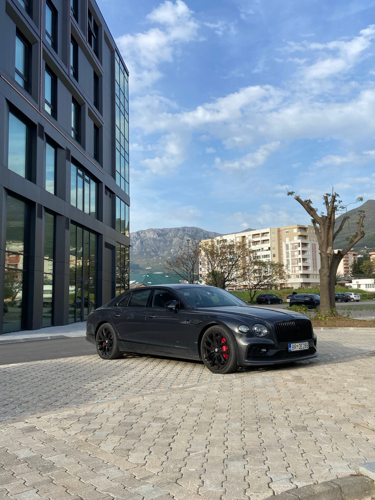The image captures a gray Bentley sedan parked on a patterned concrete surface near a modern office building in Bar, Montenegro. The building features a grid-like pattern of dark gray rectangular pane…read more
