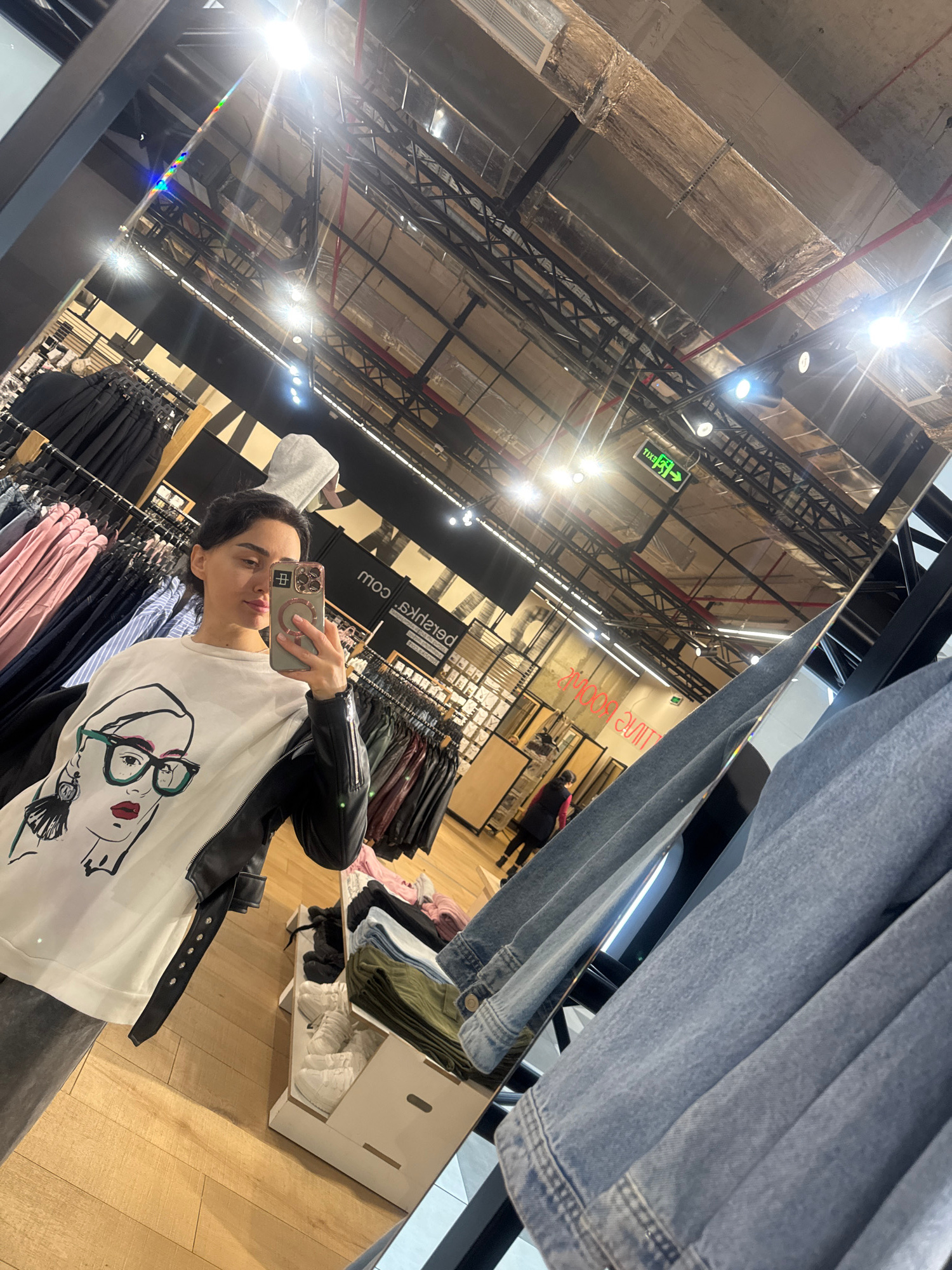 A female subject, with dark hair, is depicted in a selfie taken within a Bershka clothing store, specifically in Tbilisi, Georgia, as indicated by the reversed "Bershka.com" branding and the mirrored…read more