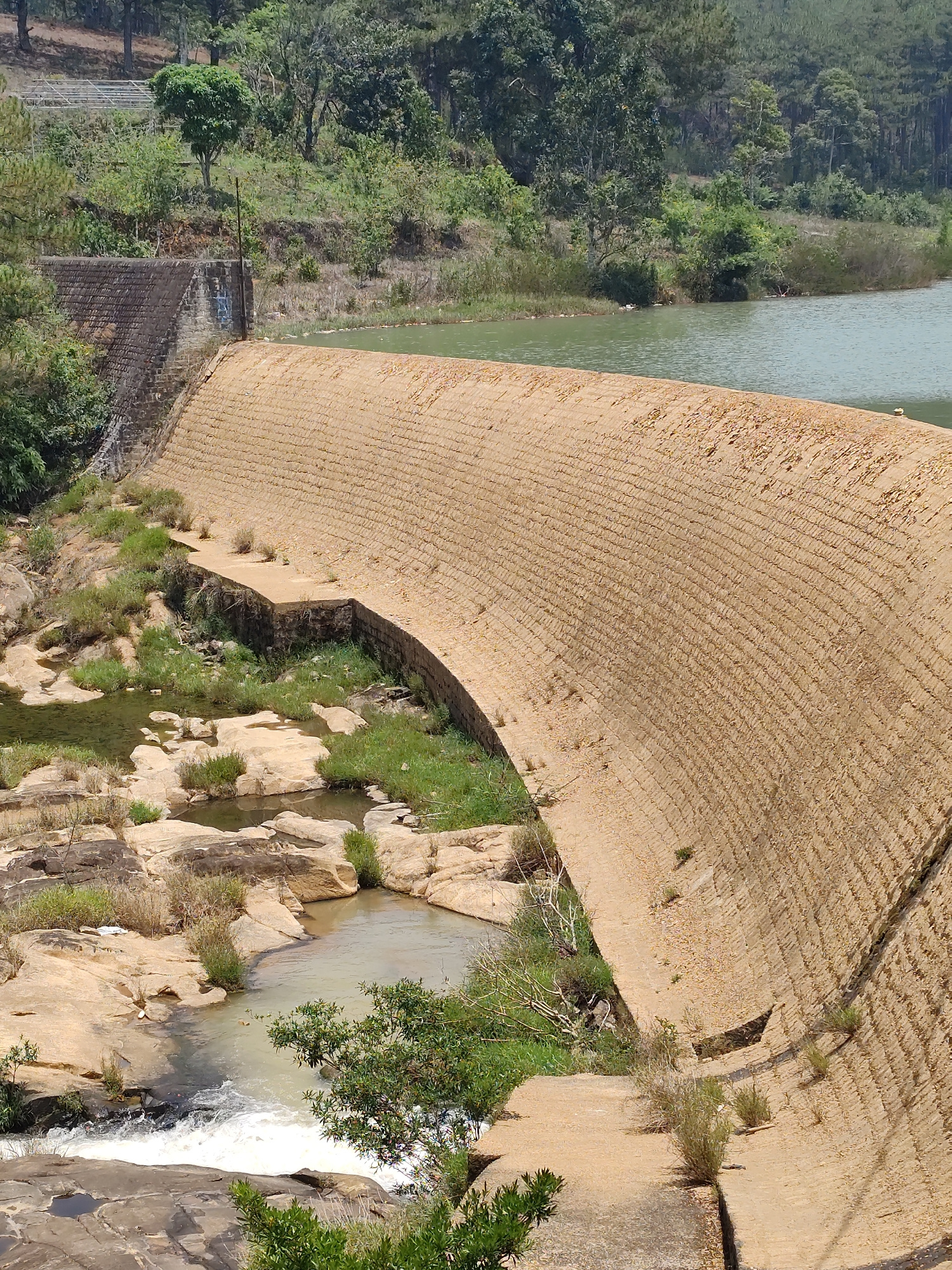 The image shows a curved dam structure in Lang Biang - Da Lat, Vietnam. The dam is constructed of textured, light-brown masonry and holds back a body of water with a greenish hue. Below the dam, water…read more