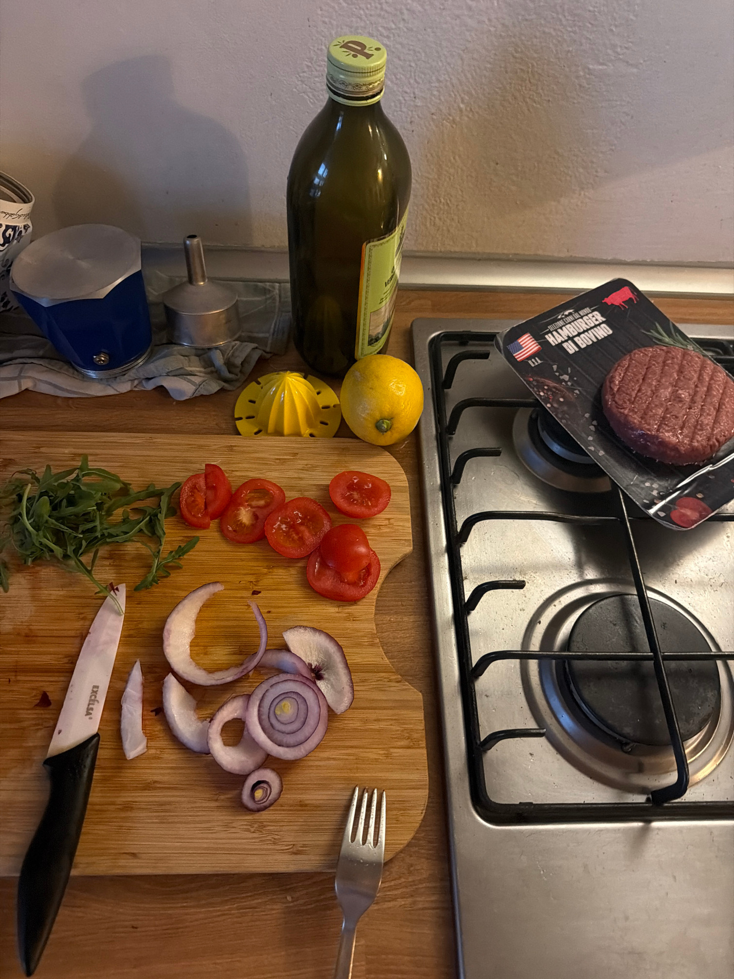 The image presents a top-down view of a kitchen scene, likely in Milan, Italy given the Italian text on the hamburger packaging. A stainless steel stovetop with two burners occupies the upper portion…read more