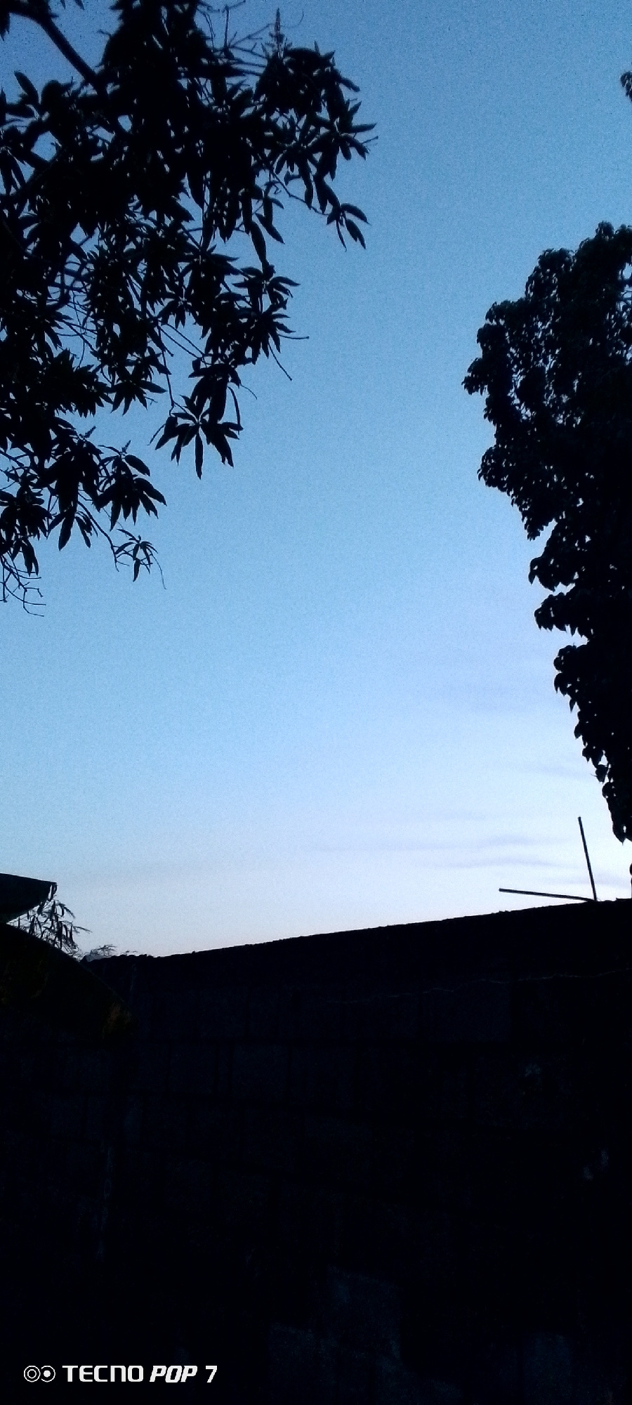 The image shows a view of the sky at dusk, with tree branches silhouetted in the top left and right corners. Below, a dark, indeterminate structure (possibly a wall or roof) occupies the lower portion…read more