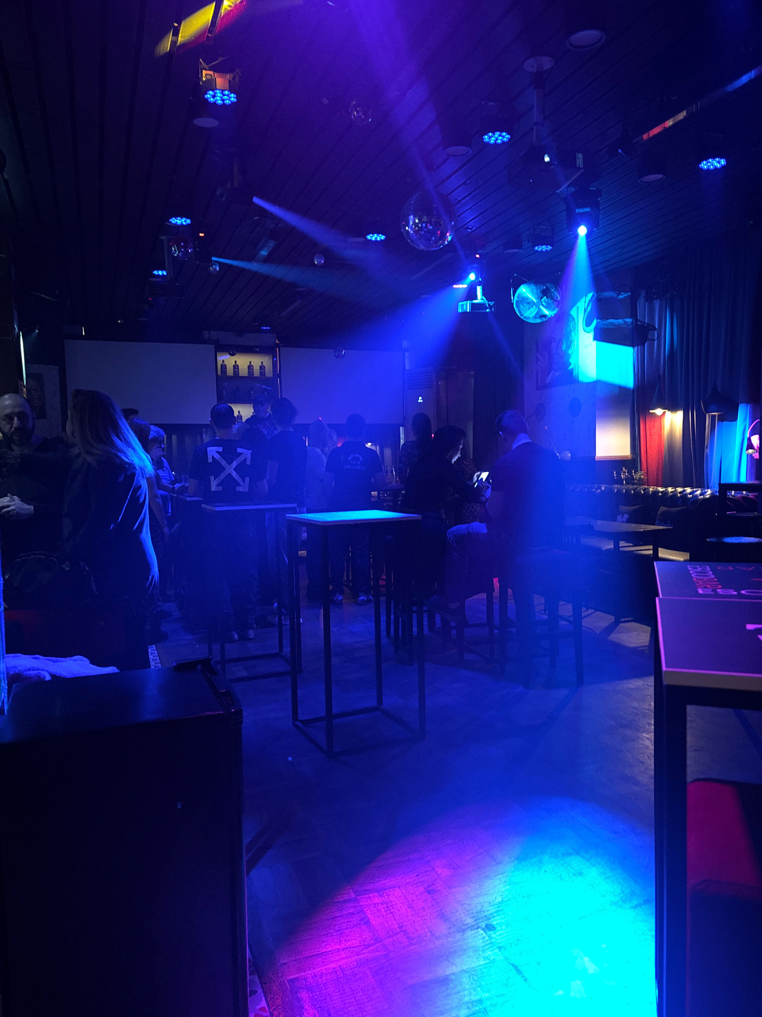 The image depicts the interior of a bar or club, possibly in Burgas, Bulgaria, based on visual details. The space is dimly lit with blue and purple stage lighting and laser beams. There are multiple p…read more