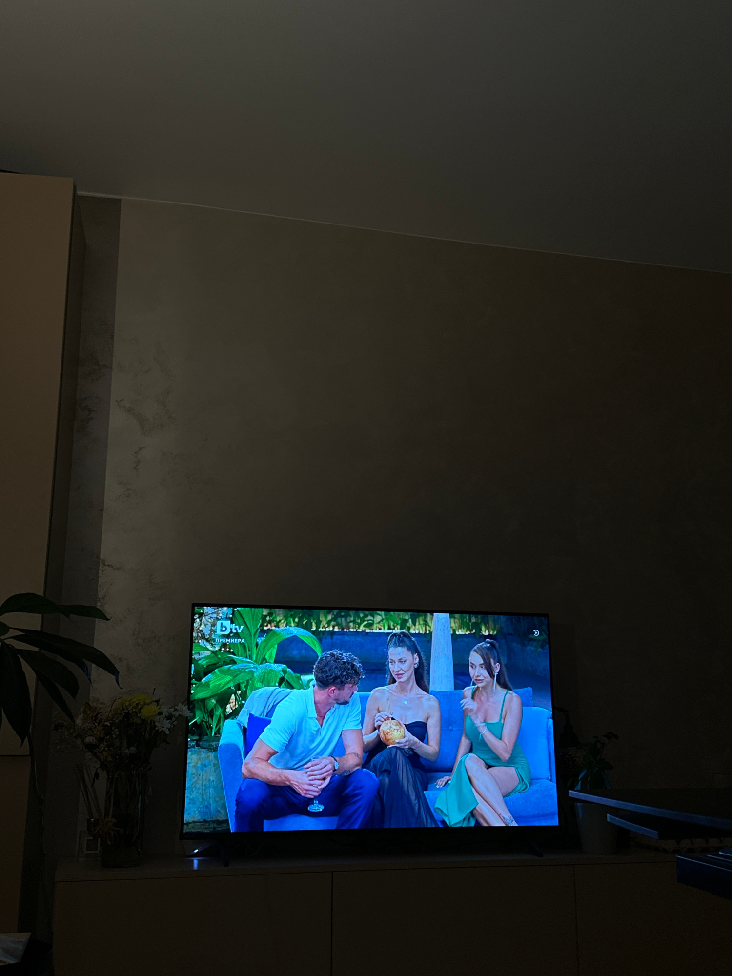 The image depicts an indoor scene at night or in low light, focusing on a television screen displaying a program. The TV screen is oriented vertically within the frame, suggesting it is mounted on a w…read more