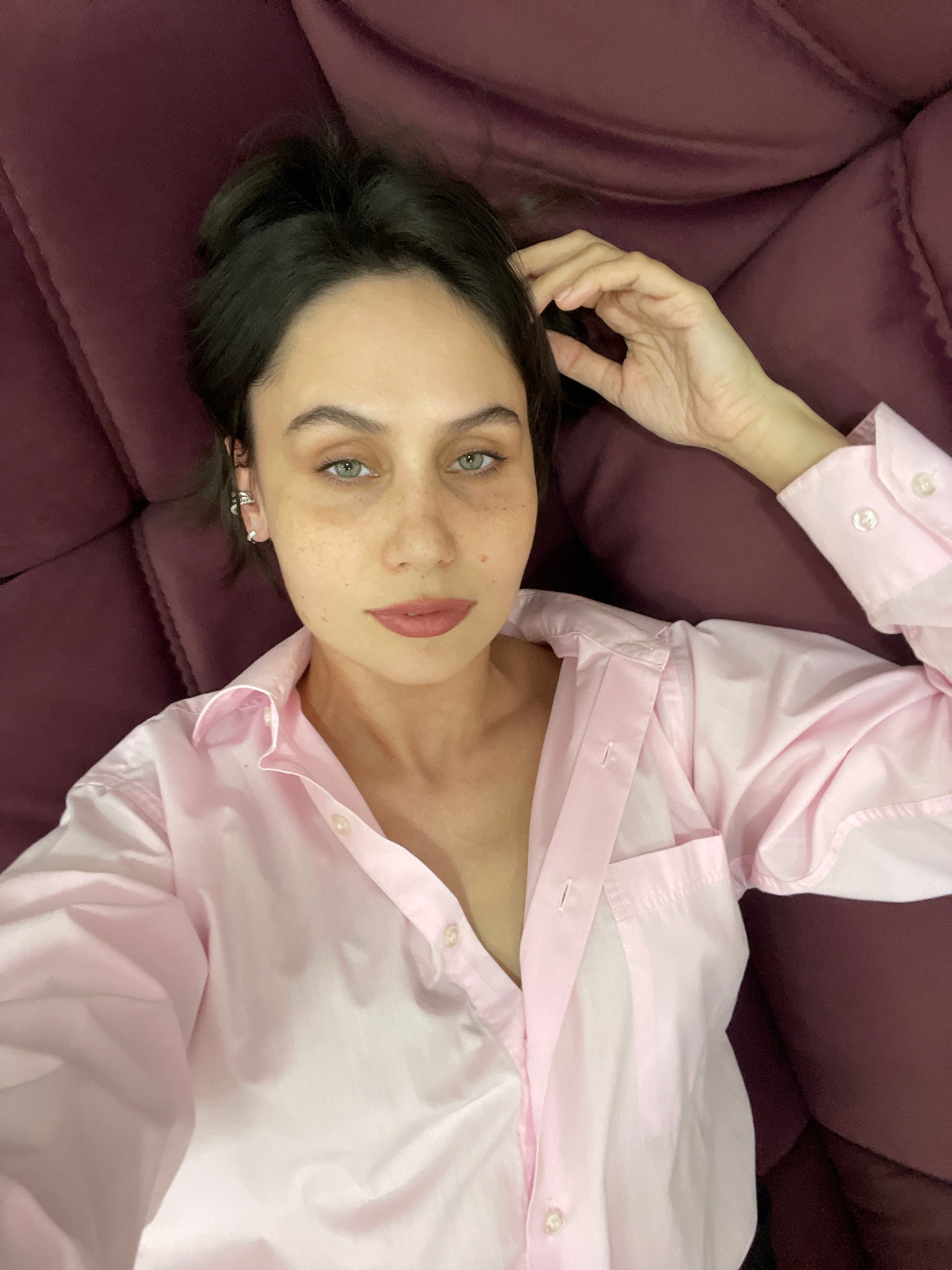 A woman with fair skin, dark hair, and green eyes is lying on a dark maroon, possibly velvet, couch. She is wearing a light pink button-down shirt, partially unbuttoned. Her right hand is near her fac…read more