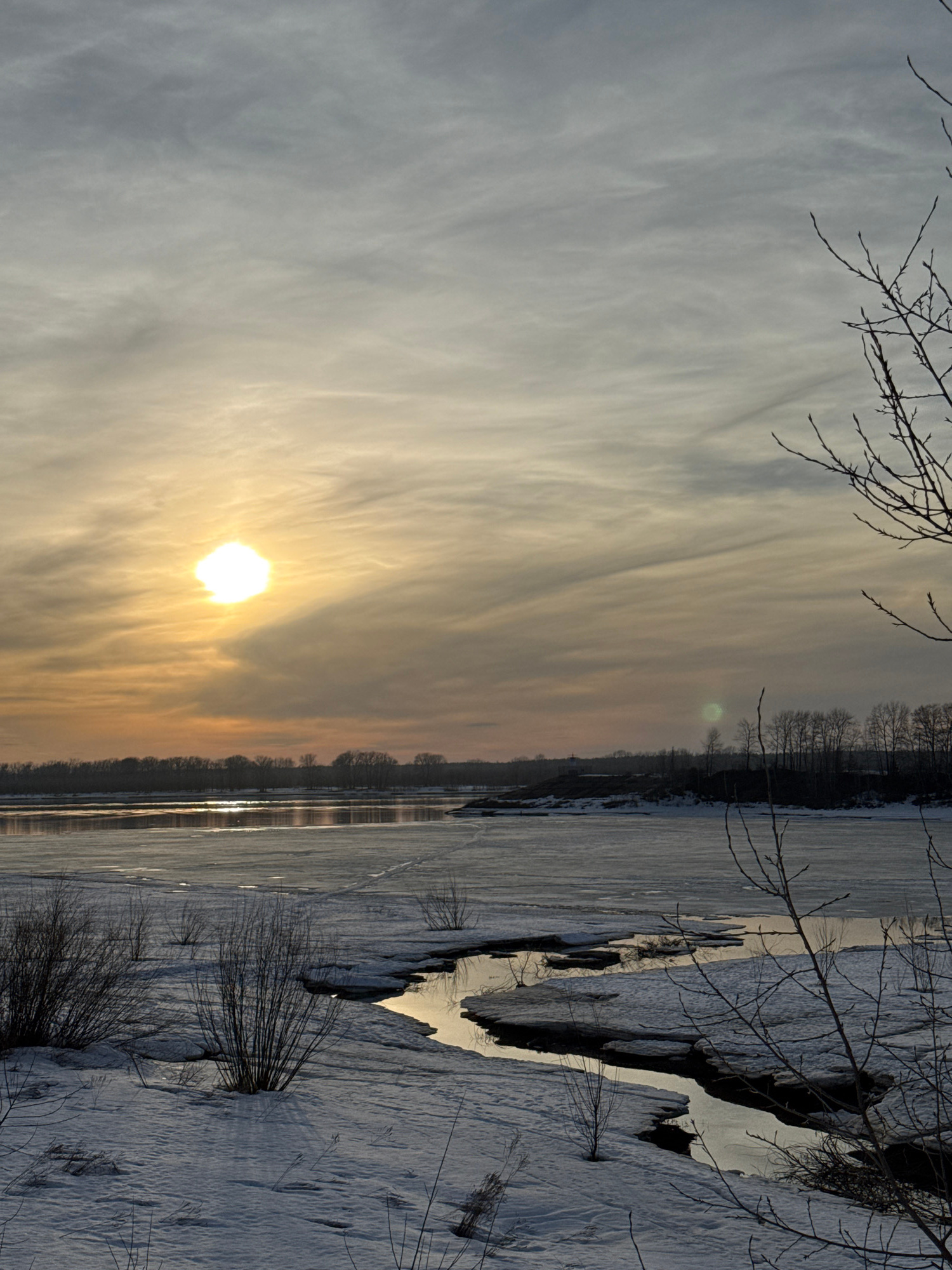 The image depicts a winter or early spring landscape in Chaikovsky, Russia, during sunset or sunrise. The scene features a wide body of water, likely a river or reservoir, partially covered with ice a…read more