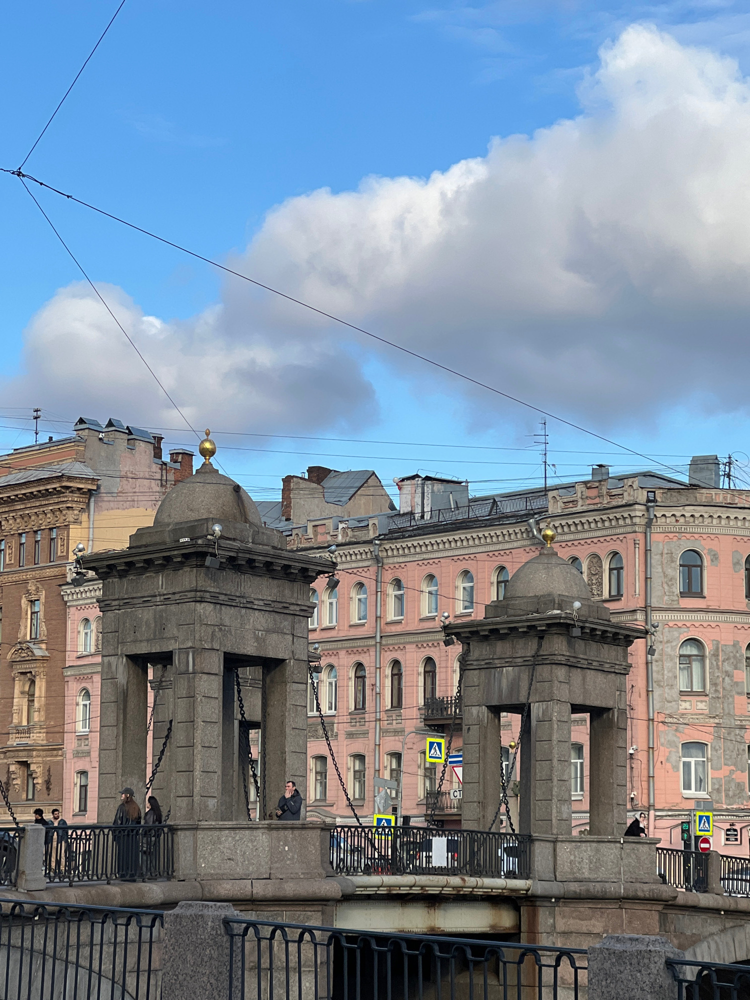 The image presents a low-angle, somewhat rotated view of Saint Petersburg, Russia. A bridge with ornate stone pillars and metal railings is the prominent foreground feature. Thick chains hang between…read more