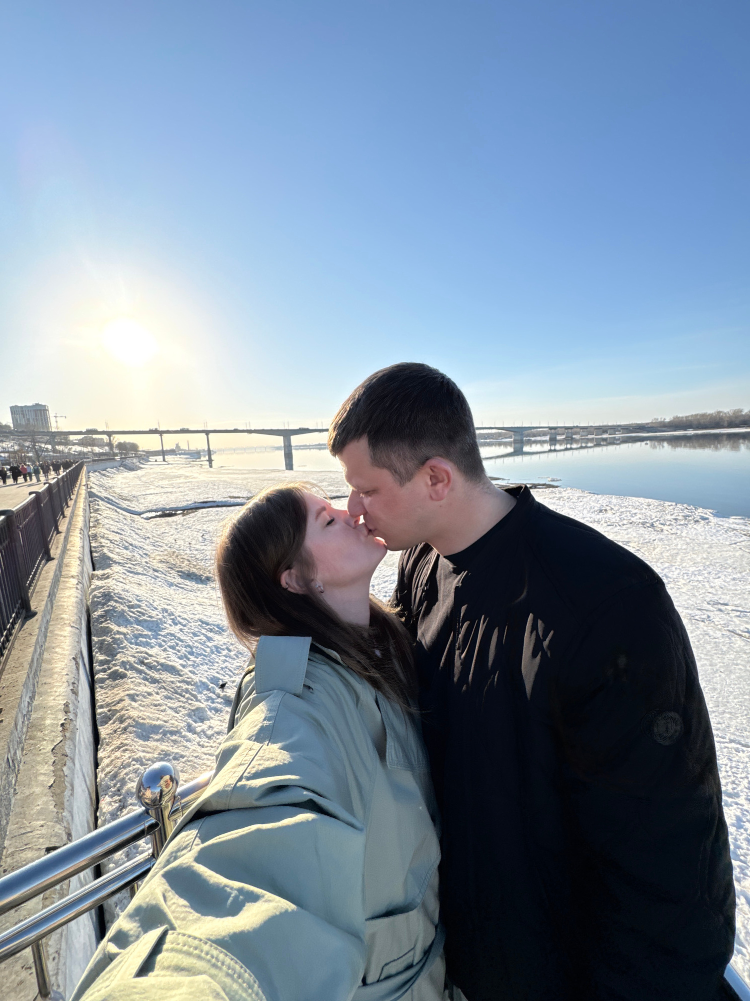A medium outdoor shot depicts a couple kissing on a sunny day. The location is the embankment of the Kama River in the city of Perm, Russia. The couple is positioned in the foreground, with the man we…read more