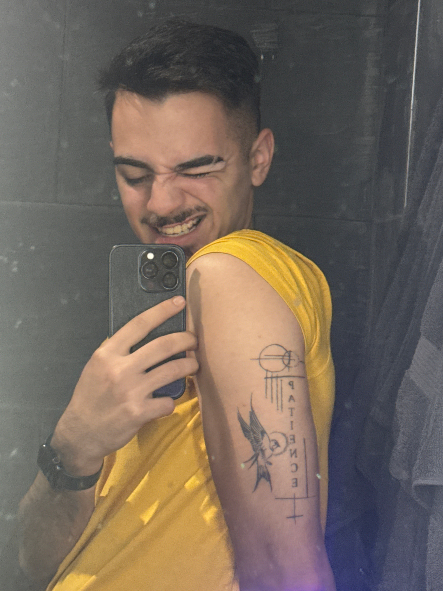 The image shows a man taking a selfie in what appears to be a restroom, given the mirror backdrop. He is wearing a yellow t-shirt and has a dark wristband or watch on his left wrist. He's holding a sm…read more