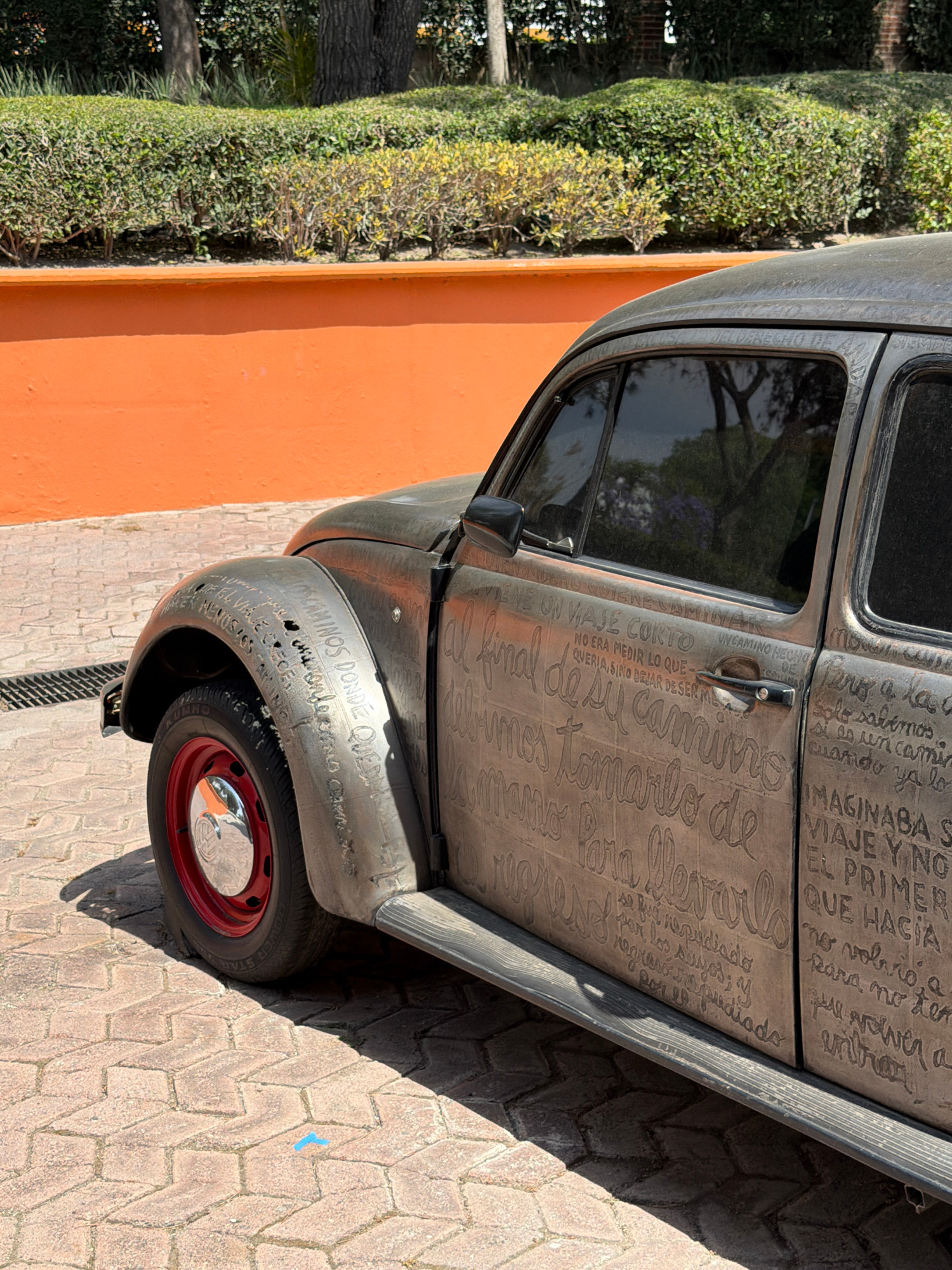 The image showcases a modified classic Volkswagen Beetle, positioned on a brick-paved area next to an orange wall and a lush green hedge. The car's body is adorned with etched text in Spanish, coverin…read more