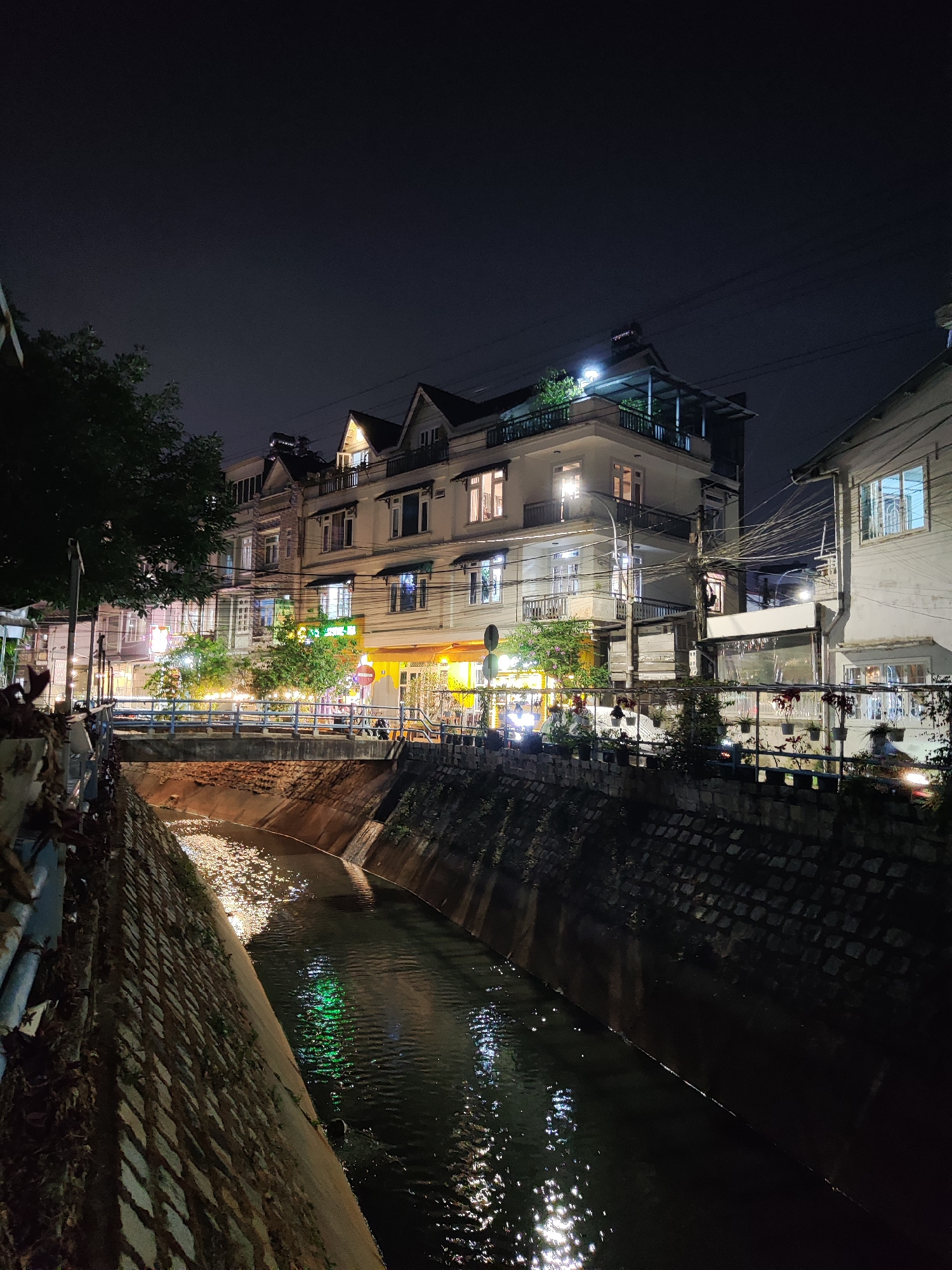 The image captures an urban night scene in Cam Ly - Đà Lạt, Vietnam. A narrow canal runs through the frame, its dark water reflecting city lights. Stone embankments line the canal's sides. A bridge wi…read more