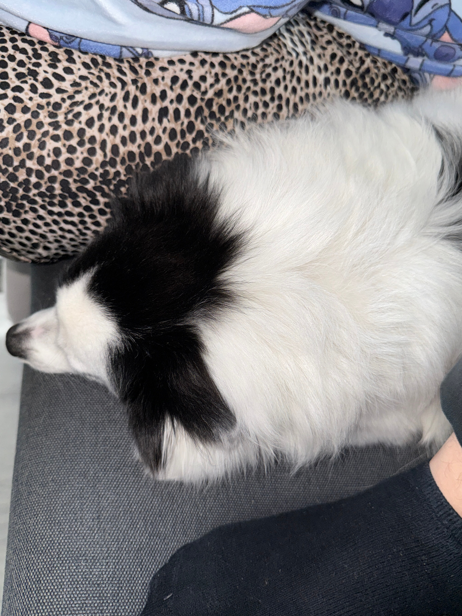 A white and black dog is shown from above. The dog's black fur covers its head down to its nose. The dog is lying on a spotted print blanket with a light blue and pink blanket on top, and a gray couch…read more