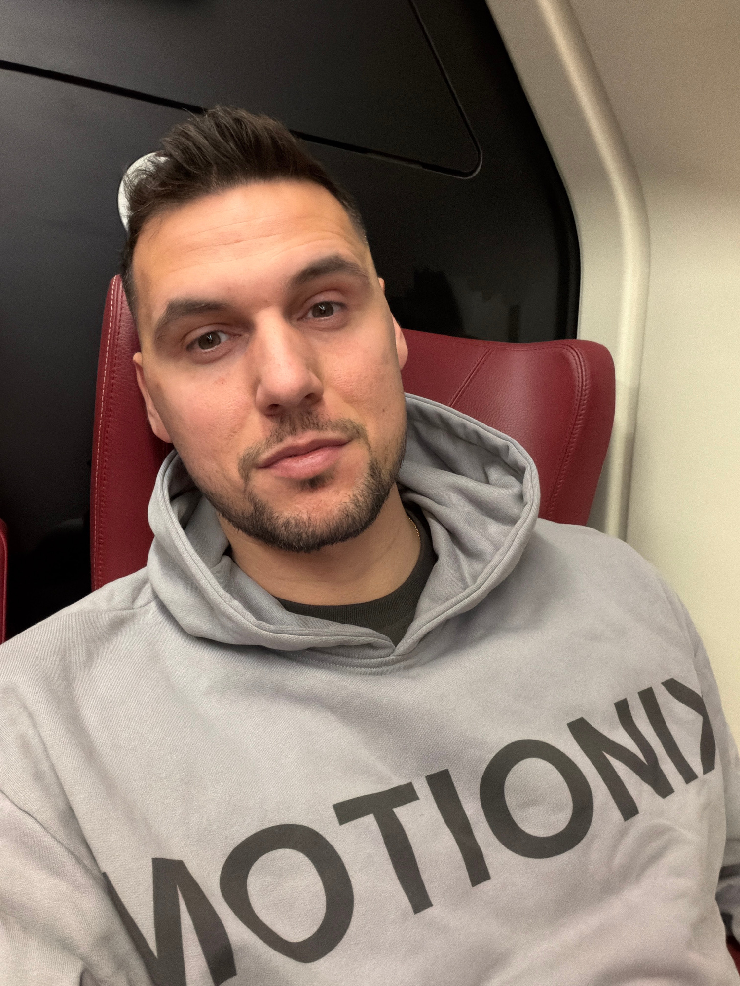 A man is reclining in a red chair. He is wearing a gray hoodie with black lettering that says "MOTION". The chair is located in what appears to be a train car, with a black surface beside the chair an…read more