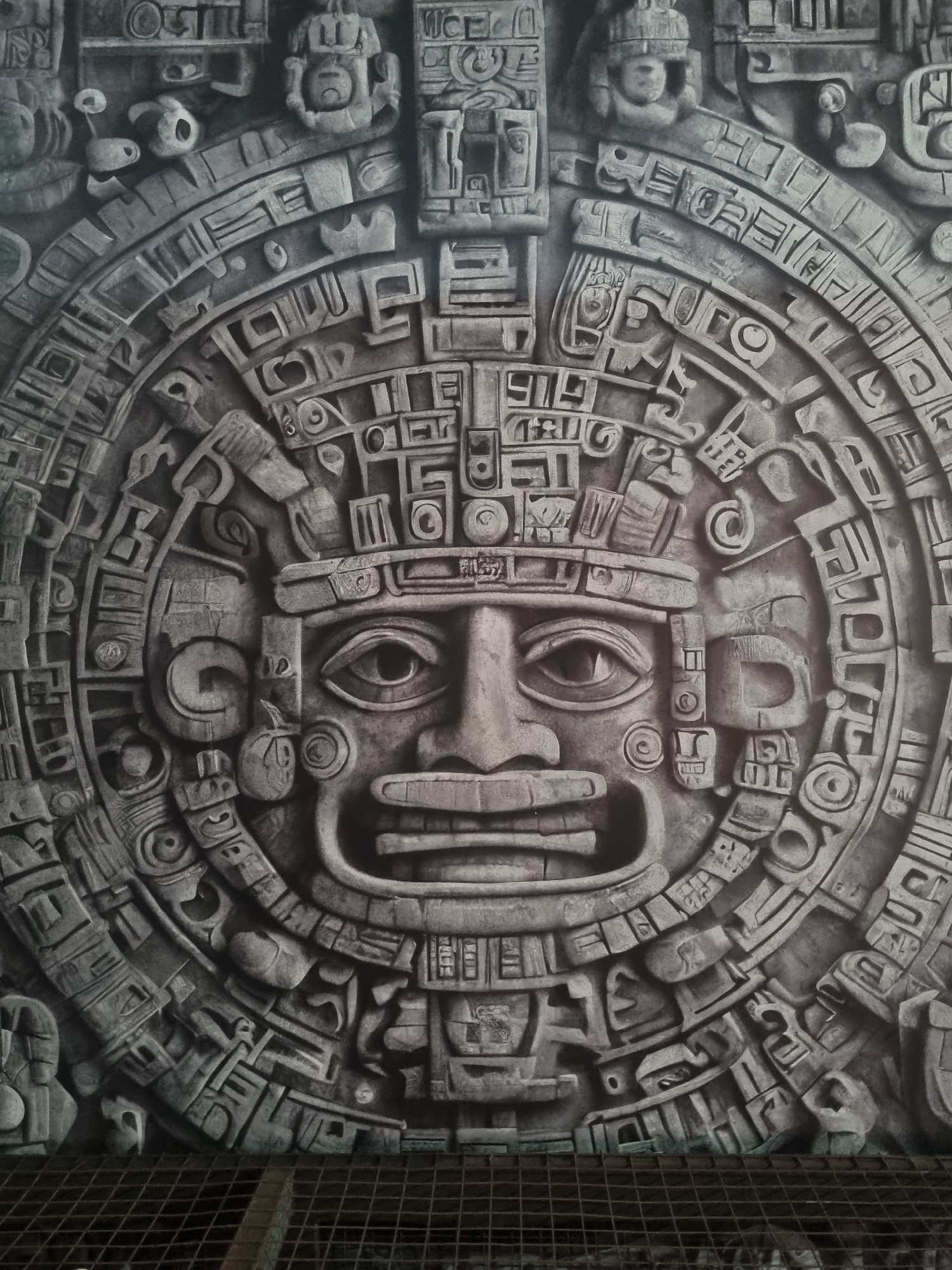 The image showcases a highly detailed, monochromatic relief sculpture, strongly reminiscent of an ancient Mesoamerican calendar stone or a deity carving. At its center is a stylized, anthropomorphic f…read more