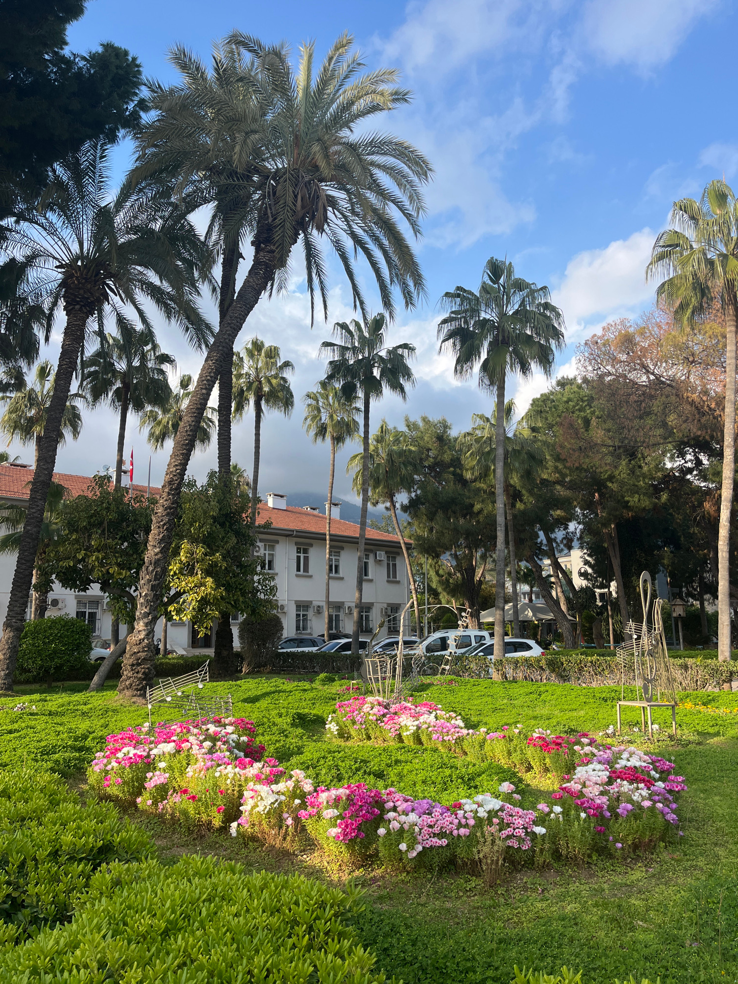 The image portrays a tranquil scene in Alanya, Turkey. The foreground features lush green grass bordered by colorful flower beds with pink, white, and purple blooms. Beyond the greenery, a row of tall…read more