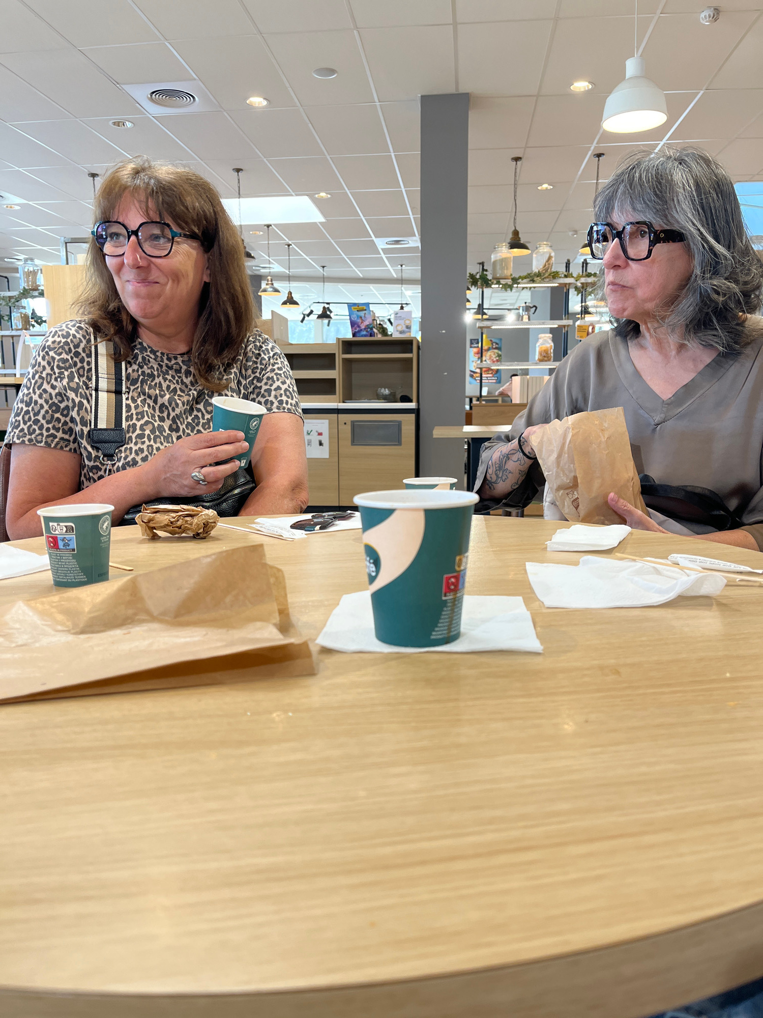 The image shows two women sitting at a light-colored wooden table in what appears to be a restaurant or cafe. The woman on the left wears a leopard-print top and glasses. She holds a green and white p…read more