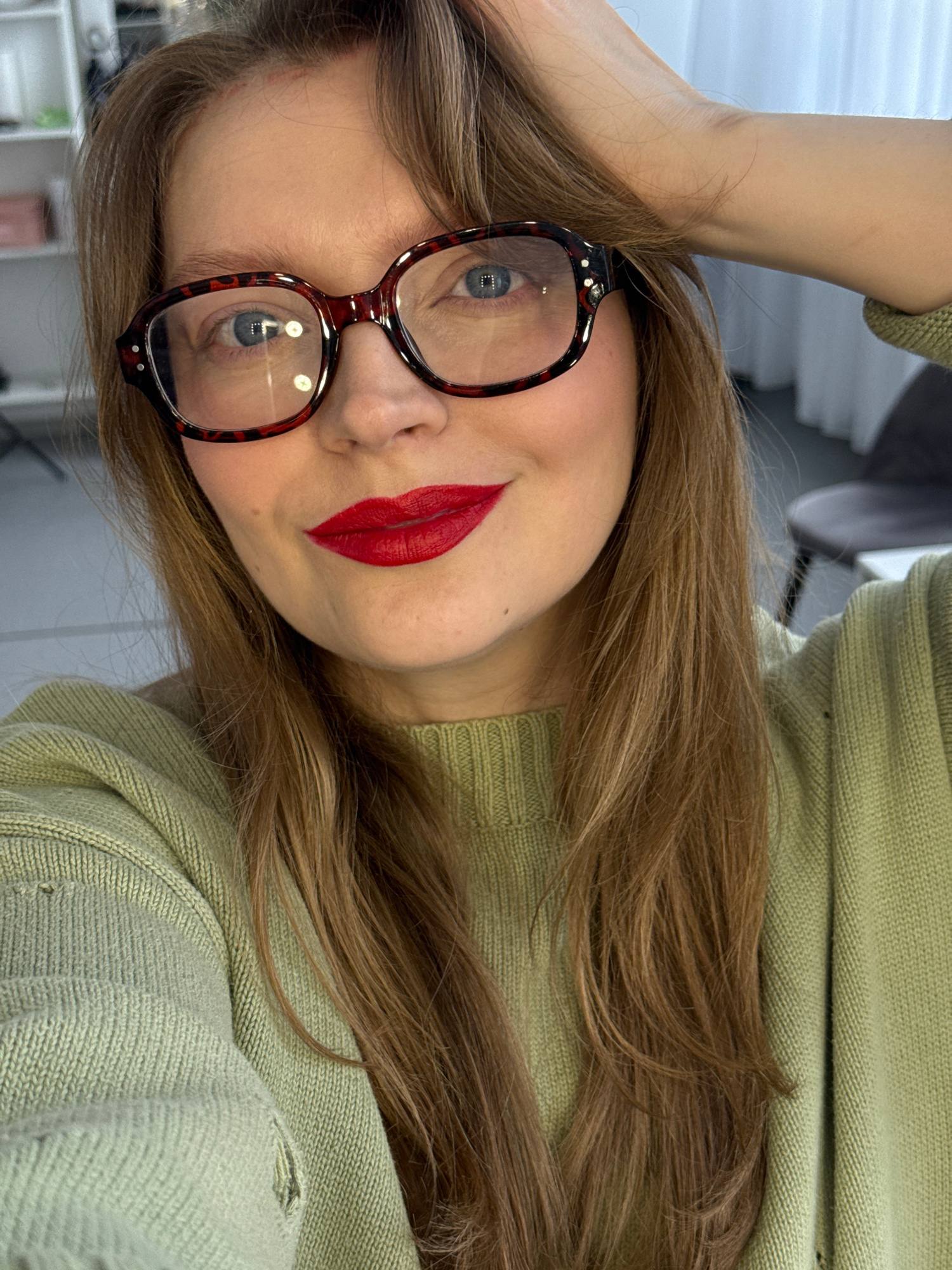 A woman with long brown hair and blue eyes is posing for a selfie. She is wearing glasses with a brown and red patterned frame. Her lips are painted with bright red lipstick. She is wearing a light gr…read more