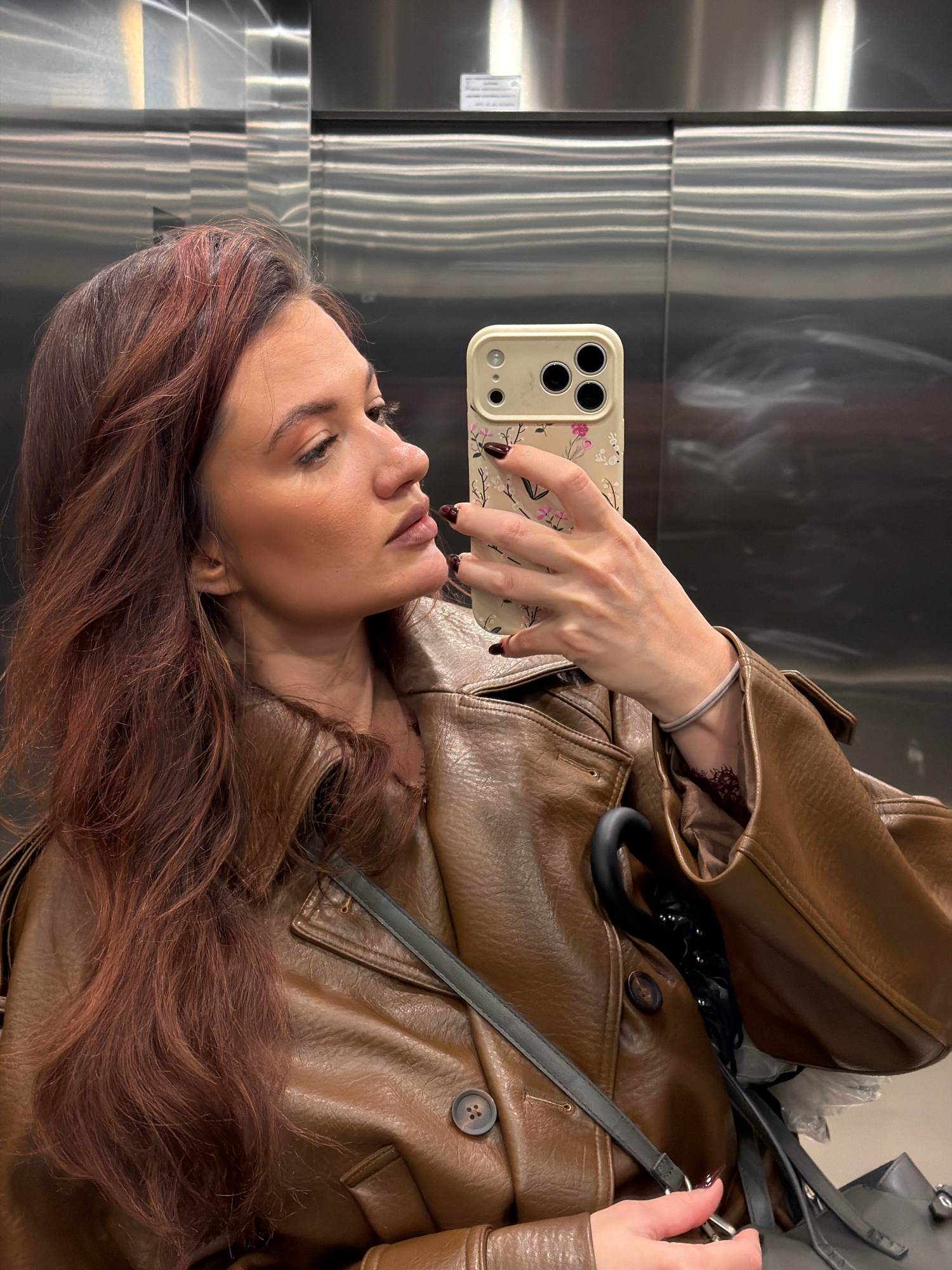 A woman is taking a selfie in an elevator with stainless steel walls. She is wearing a brown leather jacket and holding a smartphone in her left hand with a floral design case. Her hair is long and au…read more