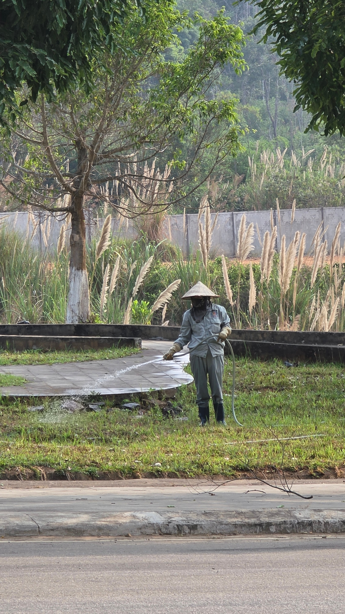 A man in protective clothing and a conical hat is spraying water on a concrete walkway in Bo Y, Vietnam. The walkway is bordered by grass and tall, feathery plants. A road runs adjacent to the walkway…read more