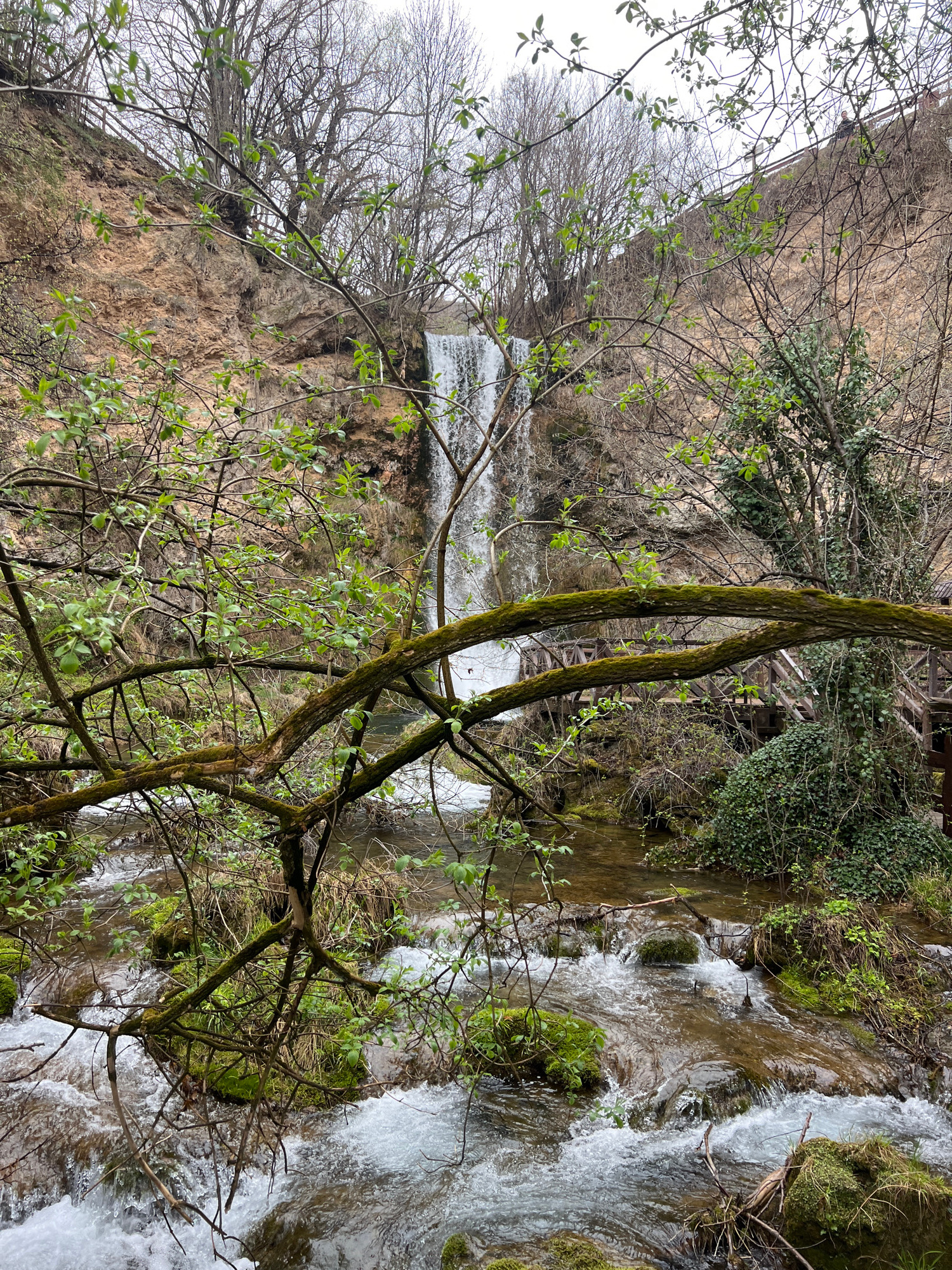 The image captures Veliki Buk waterfall (Lisine waterfall) within Despotovac Municipality, Serbia, viewed from a low angle looking upstream. A tall, narrow cascade of white water descends a steep, red…read more