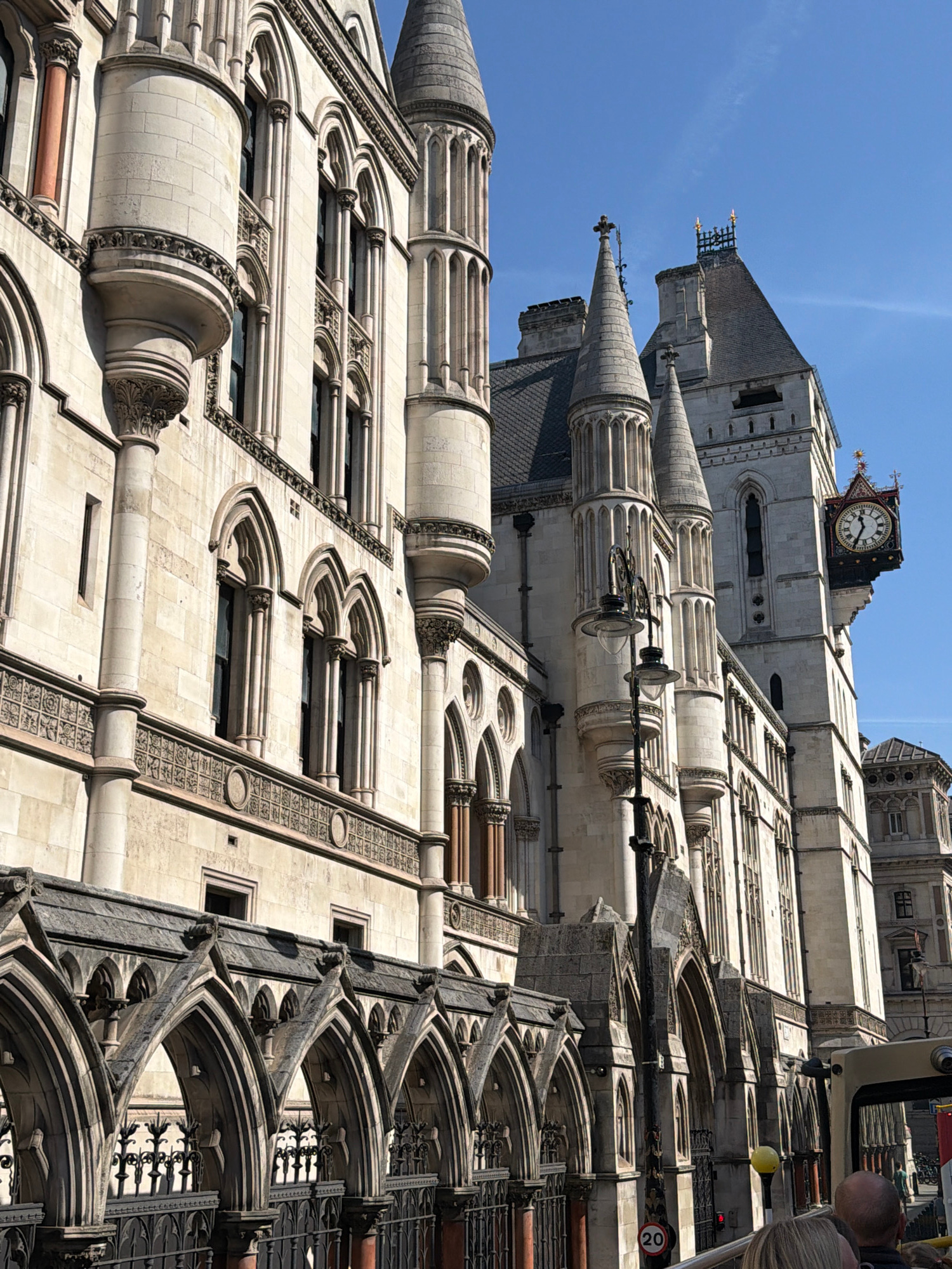 The image depicts the Royal Courts of Justice in London, United Kingdom. The building is constructed of light-colored stone and features a distinct Gothic Revival style. It showcases intricate archite…read more