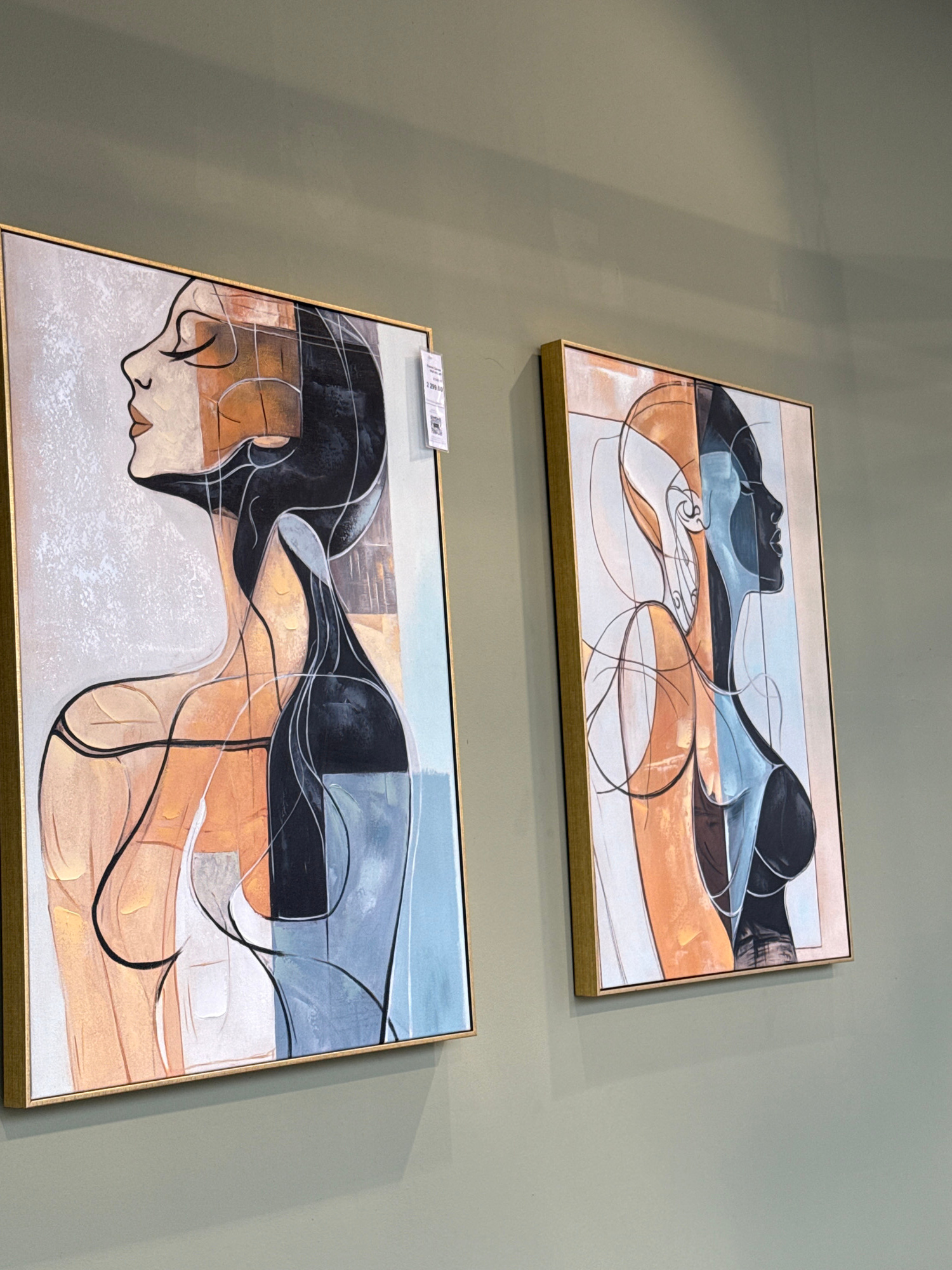Two framed abstract paintings hang on a light olive-green wall. The upper painting has a gold frame and depicts a reclining figure in shades of blue, brown, black, and white, outlined with thin black…read more