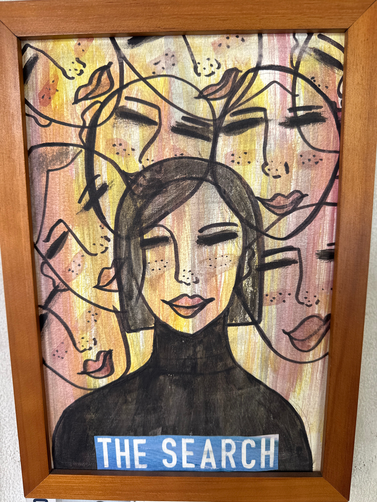 A framed abstract artwork titled "The Search" hangs on a light gray wall. The frame is made of brown wood. The artwork features a woman's face with elongated features and black hair. The words "THE SE…read more