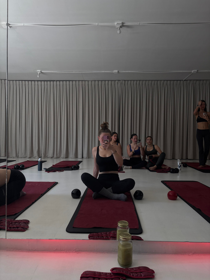 A group of women are exercising in a mirrored studio with mats and weights. One woman in the foreground is doing sit-ups, looking towards the camera. Others are working out further back, reflecting in…read more