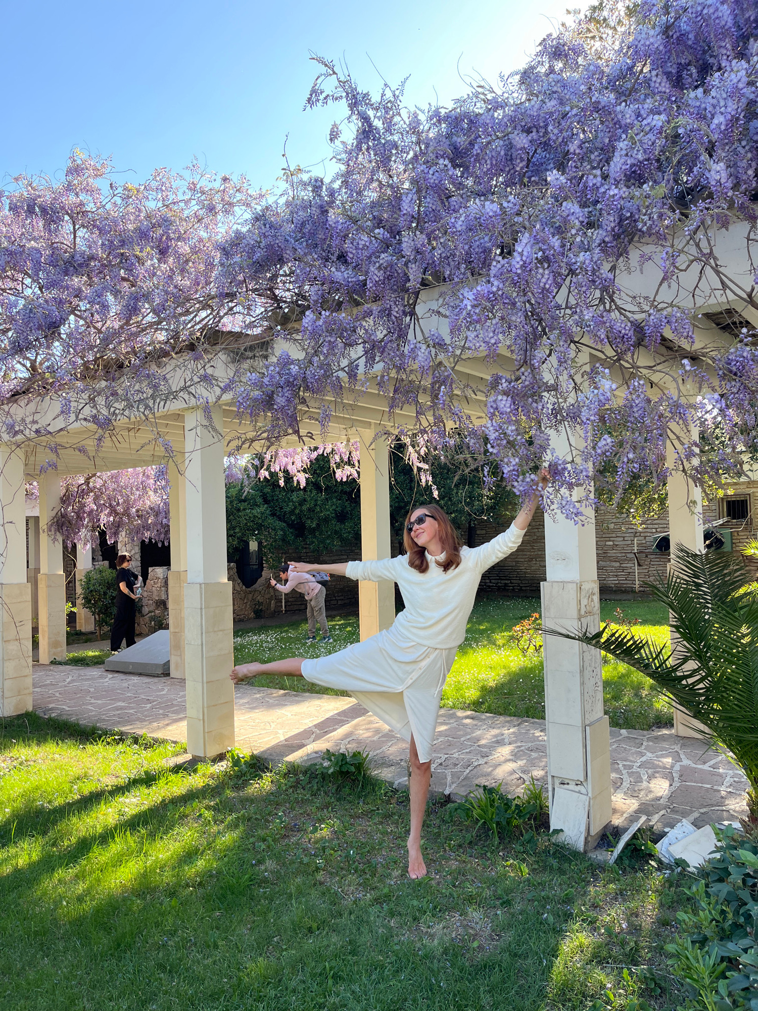 A woman wearing sunglasses and a white outfit stands on a paved walkway under a pergola covered in purple wisteria flowers. Her left arm is extended towards the flowers, and she balances on one leg. B…read more