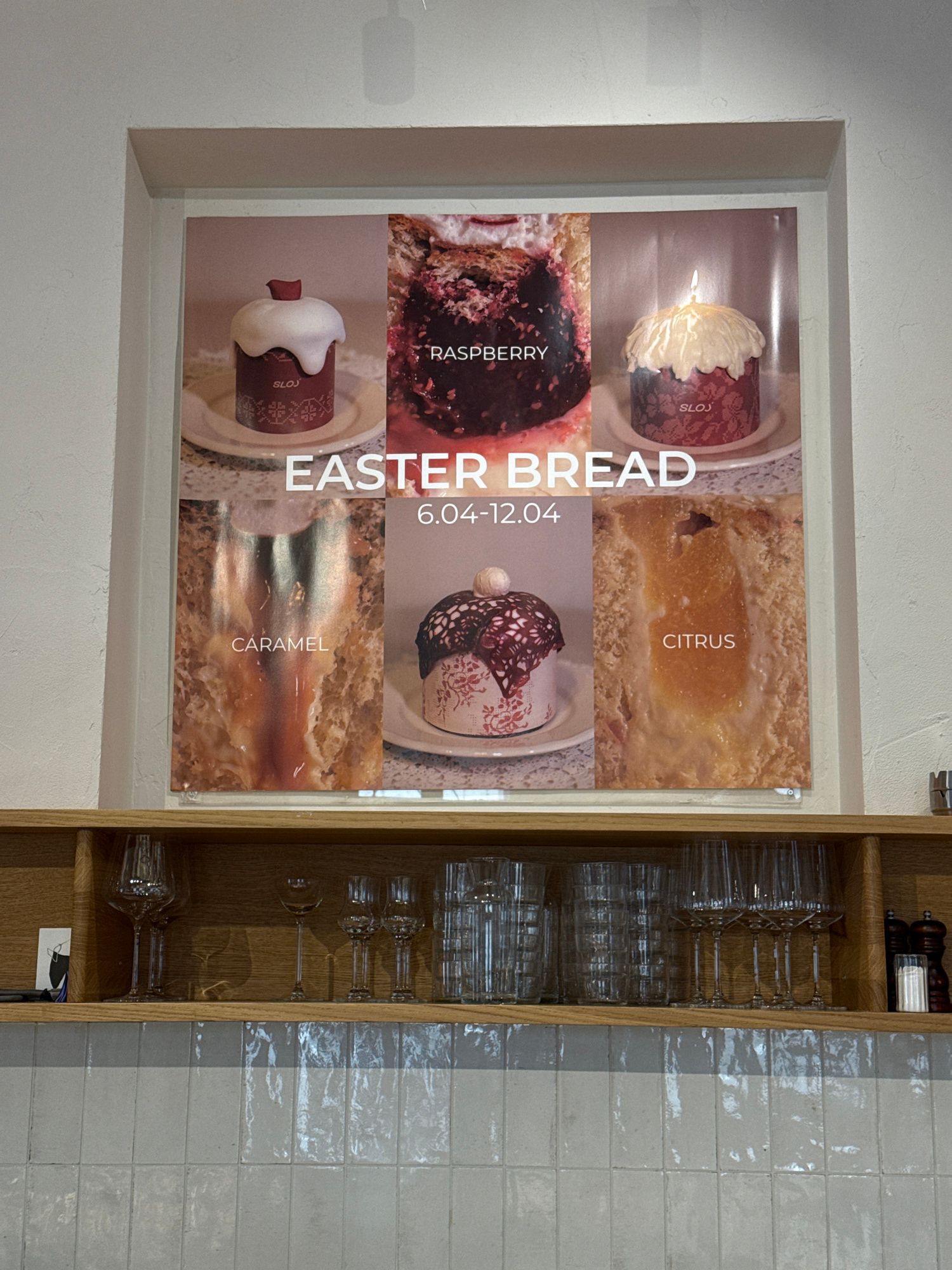 The image displays a framed advertisement poster on a light-colored wall, positioned next to a wooden shelving unit and a tiled wall, suggesting an indoor commercial or dining setting. The poster, int…read more