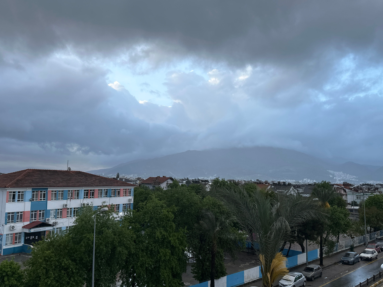 The photograph shows a cityscape in Fethiye, Turkey under a cloudy sky, likely during or after rainfall, as the road appears wet. A large building with a brown tile roof, painted in blue, white, and p…read more