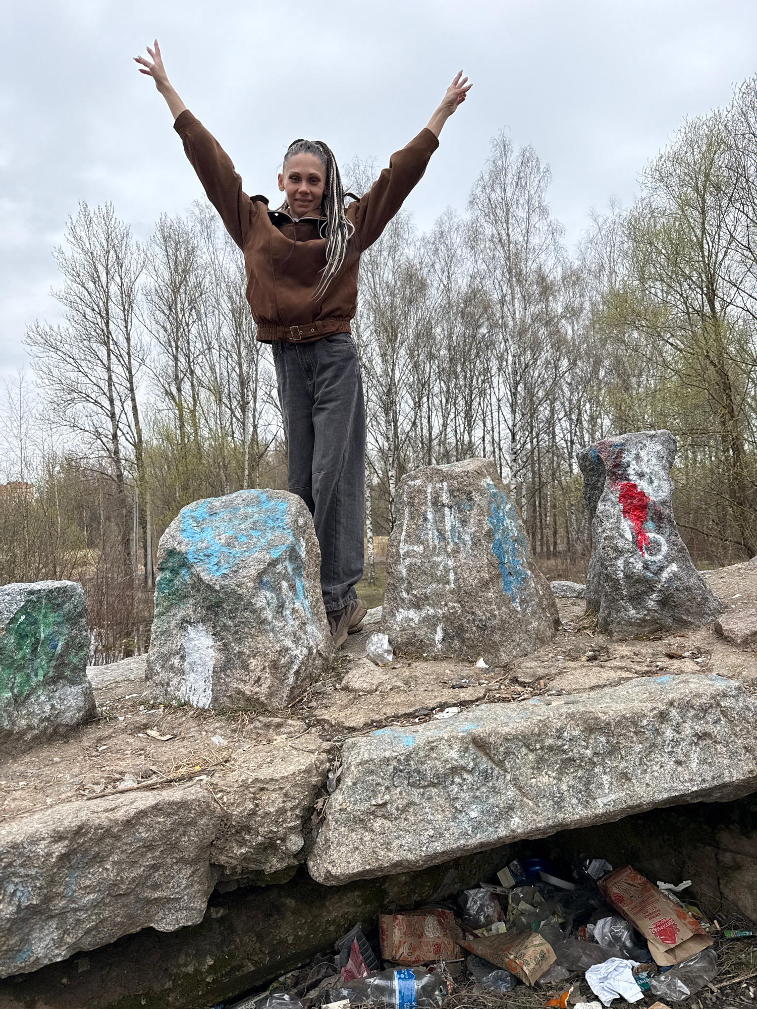 A young woman with long, light-colored braided hair is standing on large, gray rocks in Rusanovo, Russia. She is wearing a brown jacket and dark gray pants, and she is smiling with her arms outstretch…read more