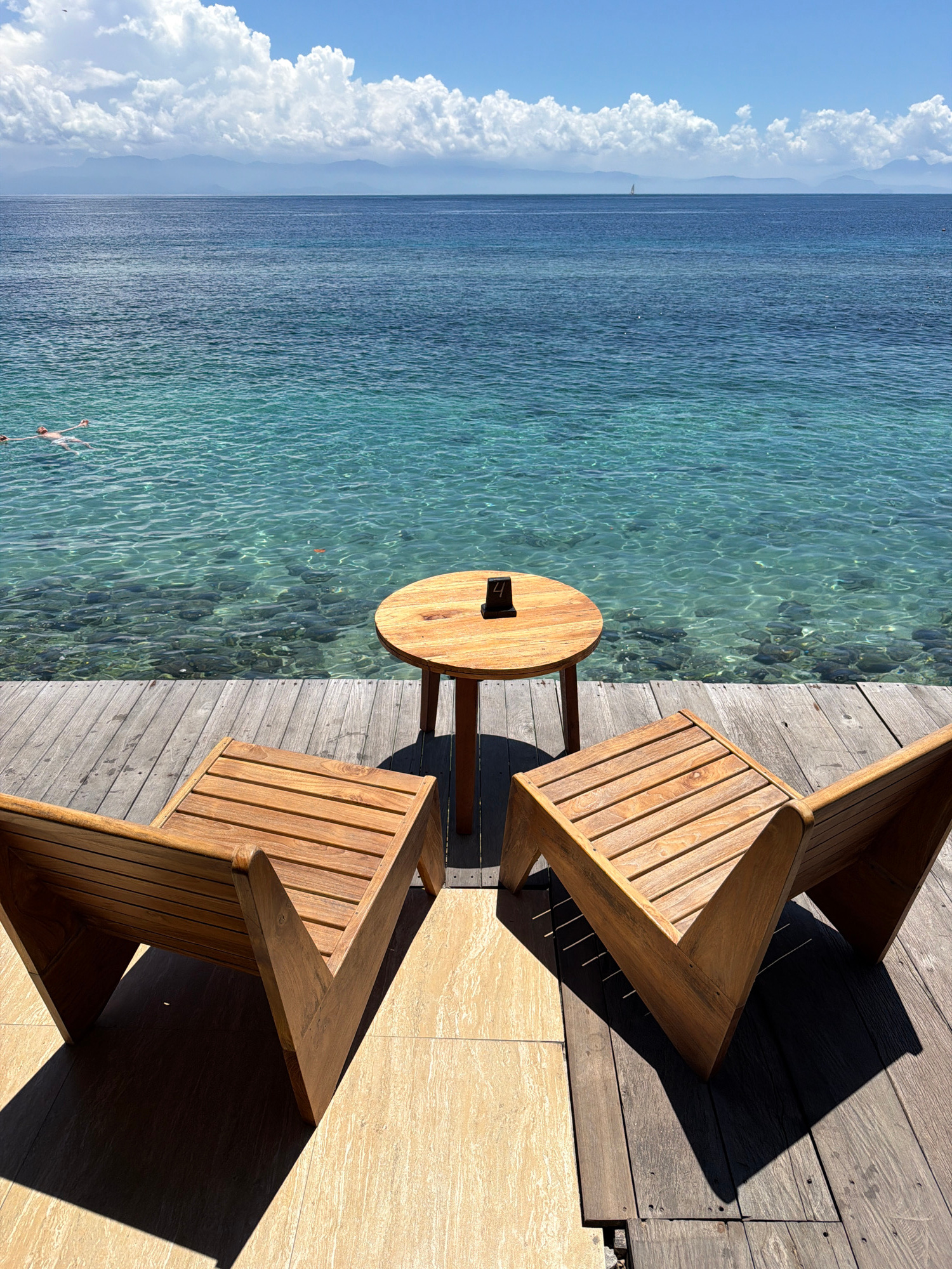 The image depicts a seaside setting, likely in Batununggul, Indonesia, where clear turquoise water meets a wooden deck furnished with two wooden chairs and a small round table. A person is visible inโฆread more