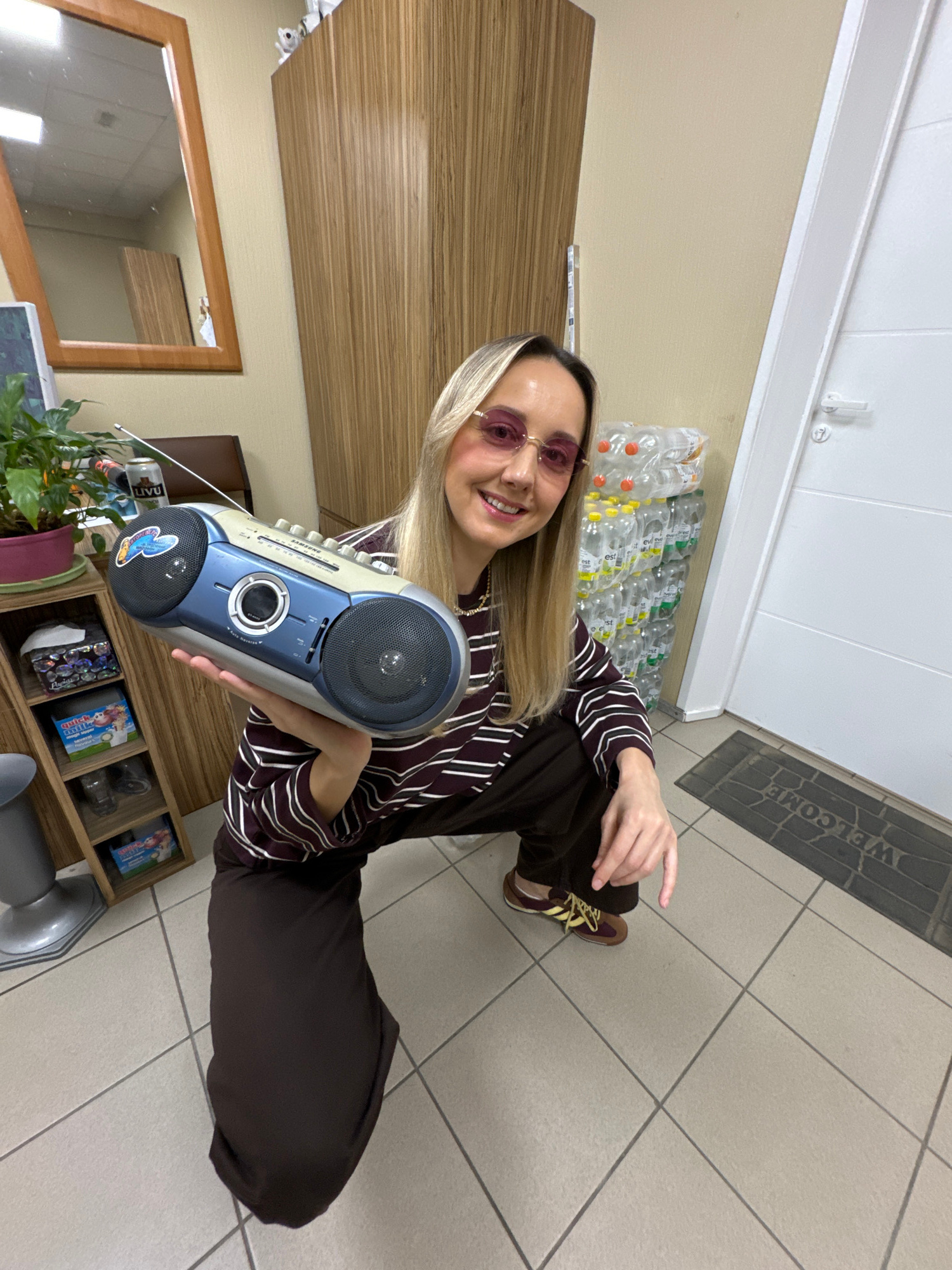 A woman with blonde hair and wearing pink sunglasses is crouching on a tiled floor in what appears to be an indoor setting. She's holding a blue and silver boombox. A "welcome" mat is visible near a w…read more