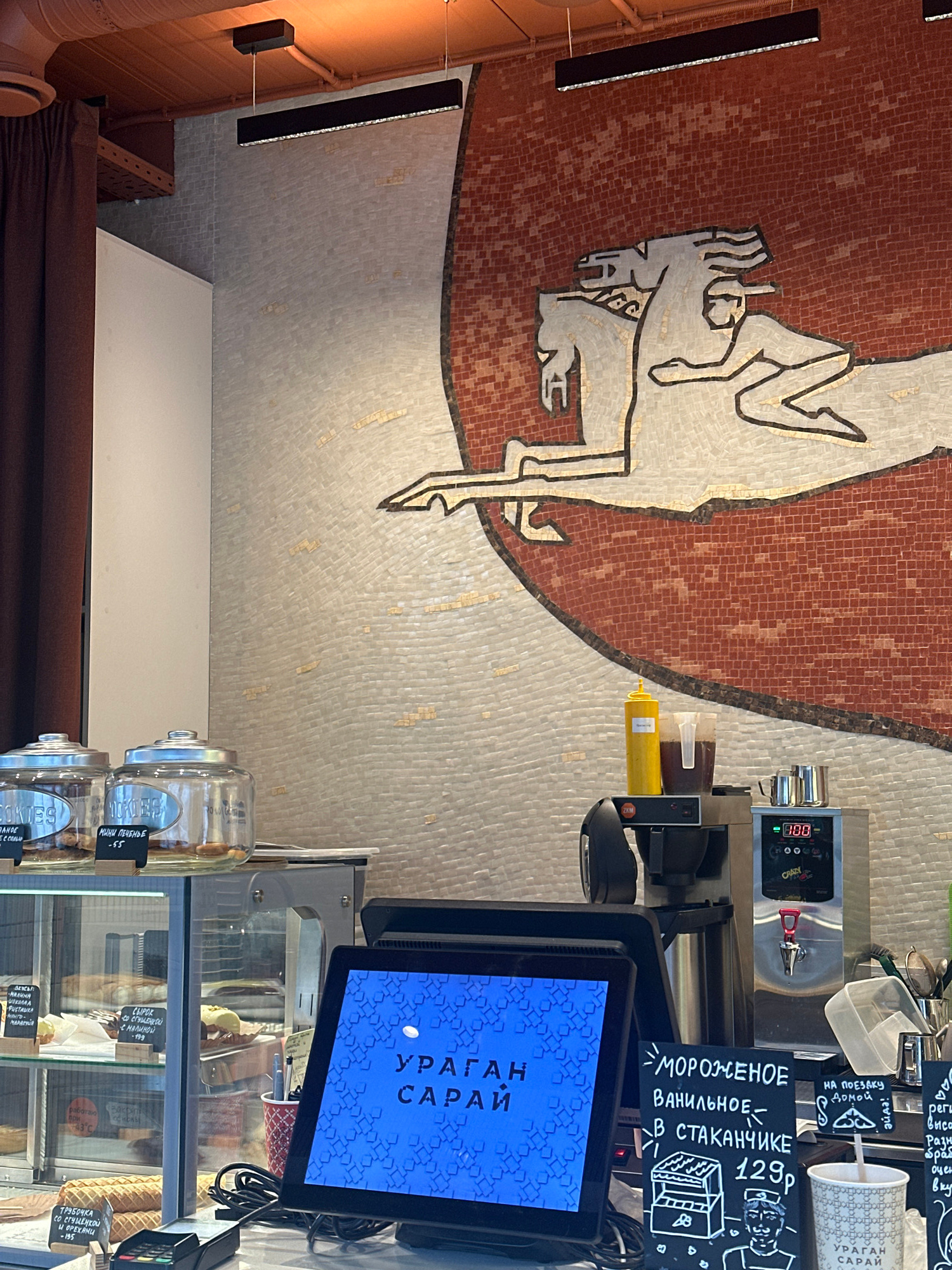 Here's a forensic description of the image: **Location:** This scene appears to be inside a small cafe or shop, specifically in Kazan, Russia, based on the Russian language signage. The name of the establishment is likely "Ураган Сарай" ("Hurricane Saray"). **Environment:** The space is decorated with a mosaic mural on the wall, featuring a horse-like figure. The interior lighting seems warm, possibly from overhead fixtures. **Objects:** * A display case is filled with various baked goods and sweets, with price tags visible for items like mini cookies ("МИНИ ПЕЧЕНЬЕ -55") and pastries. * Jars filled with cookies. * A Point of Sale (POS) system with a screen showing the establishment's name. * A drink dispenser, possibly for ice cream or coffee. * Signage advertising vanilla ice cream ("МОРОЖЕНОЕ ВАНИЛЬНОЕ В СТАКАНЧИКЕ - 129p"). * Cups for take-away. **Subjects and Actions:** The scene is static, with no people directly visible. However, the setting suggests that customers would typically be purchasing items from the display case and ordering drinks at the counter. | Open Wire