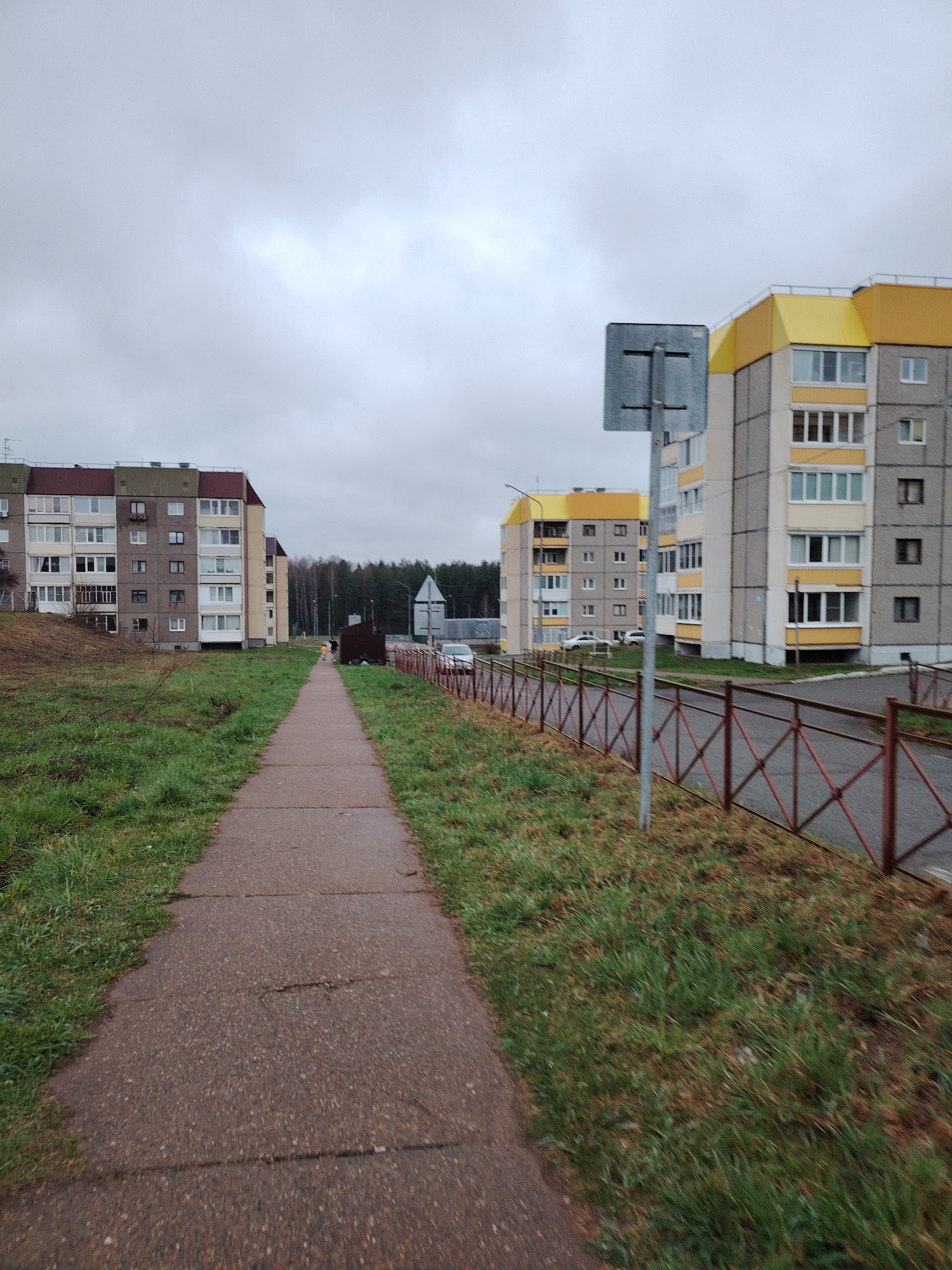 The photograph depicts a street scene in Markovskii, Russia. A paved sidewalk stretches into the distance, flanked by grassy areas on both sides. On the left, there is a multi-story residential buildi…read more