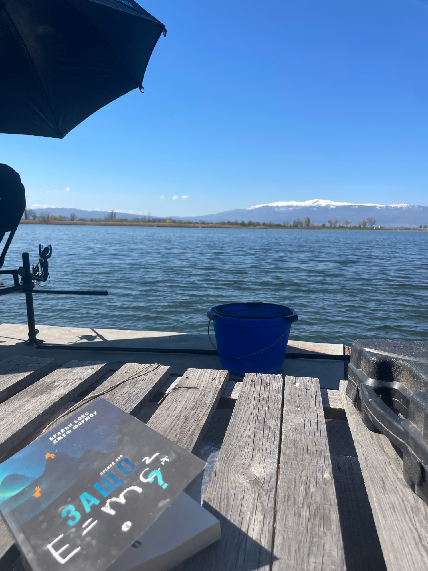The image shows a view from a wooden dock or platform overlooking a body of water with mountains in the background under a clear, blue sky. On the dock, there is a blue bucket, a fishing rod stand, a…read more