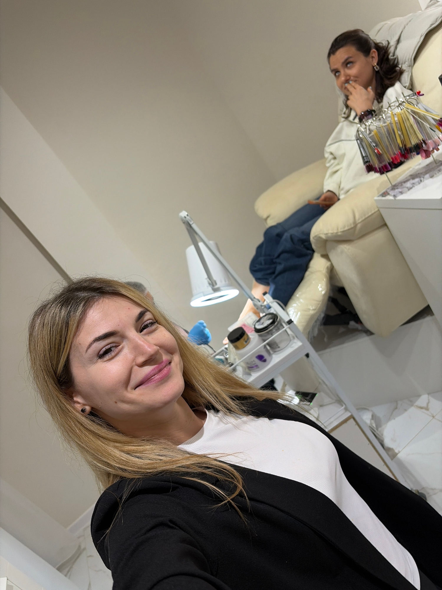 The scene depicts two women in what appears to be a beauty salon, likely in Budva, Montenegro, based on the title. One woman is reclining on a chair, examining a display of nail polish colors. She is…read more