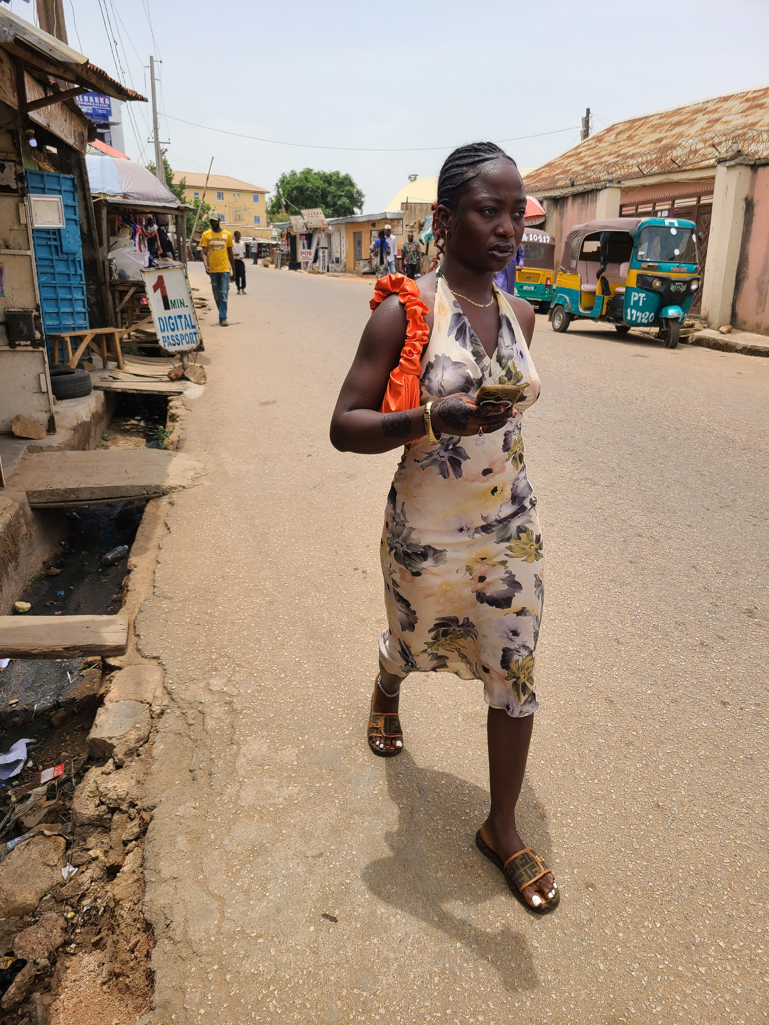 A medium shot captures a dark-skinned woman in Jos, Nigeria, standing on a paved road lined with buildings and drainage. The woman, positioned slightly off-center, wears a floral print dress with oranβ¦read more