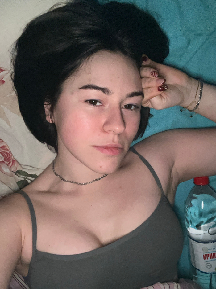 A young woman reclines on a floral patterned surface, likely a bed. She wears a thin-strapped tank top and a delicate silver chain. Her dark hair frames her face, and her nails are painted a dark colo…read more