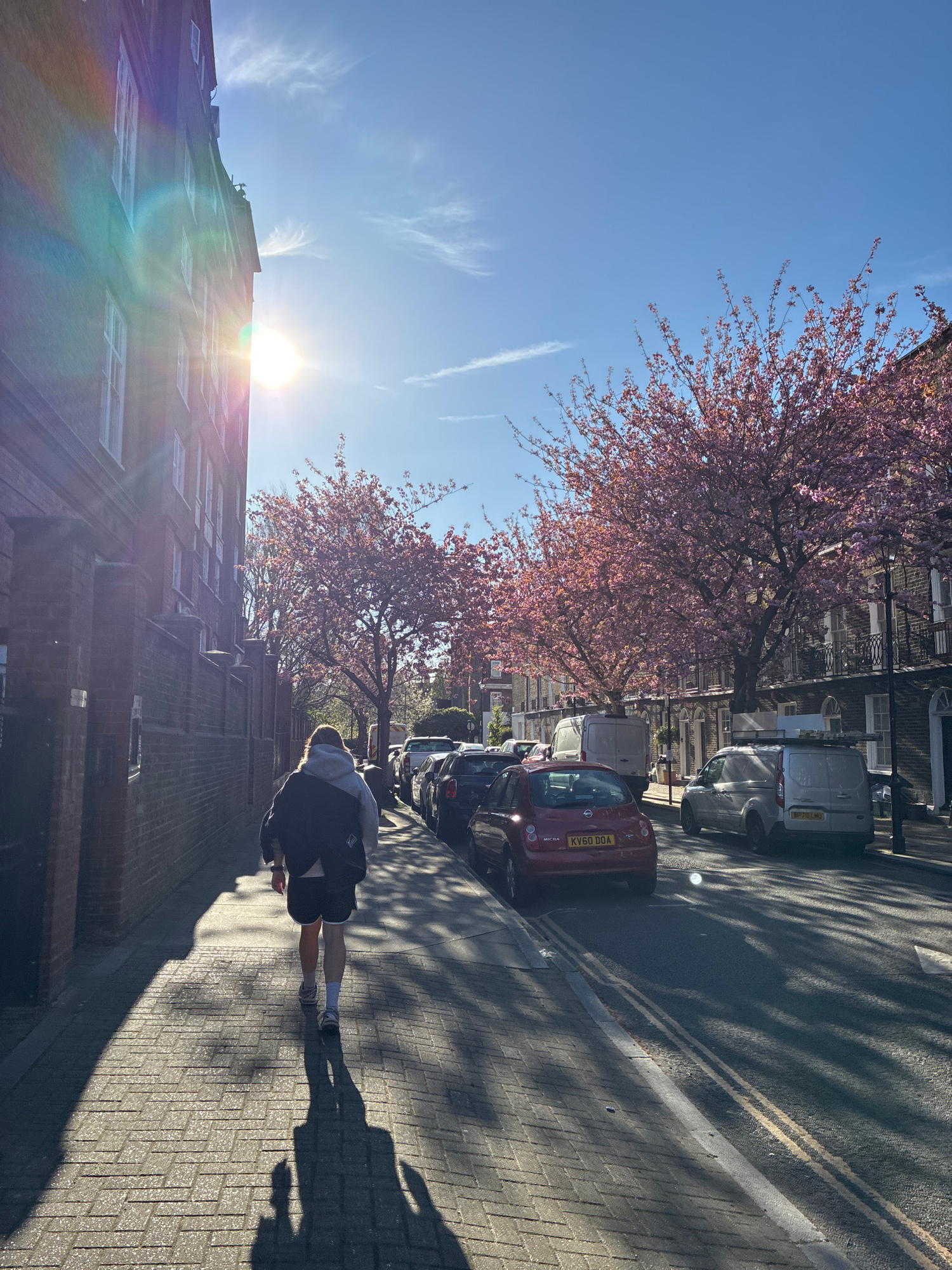 A street scene in London, United Kingdom, is captured on a sunny day. The street is lined with parked cars and flowering trees with pink blossoms. On the sidewalk, a person is bent over, their upper b…read more