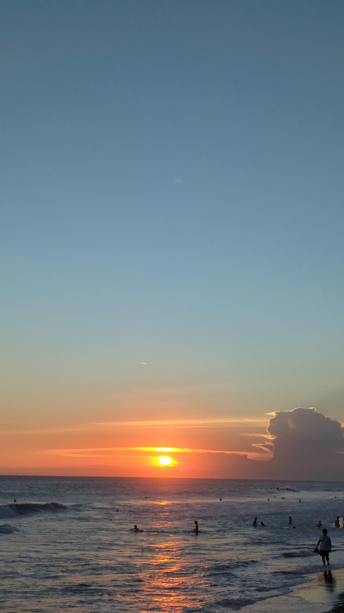 The image captures a sunset scene at a beach, possibly in North Kuta, Indonesia, given the composition. The sky transitions from a clear blue to a warm orange near the horizon, where the sun is settin…read more
