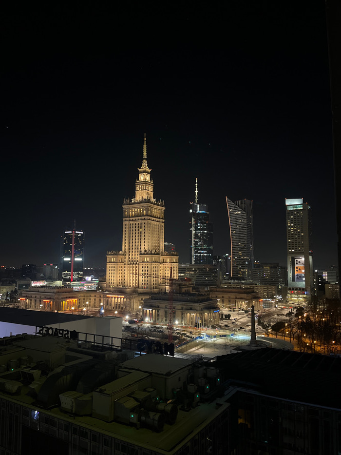 A nighttime cityscape features illuminated buildings against a dark sky. A tall, ornate building with a spire dominates the center. Modern skyscrapers rise in the background, some displaying digital s…read more