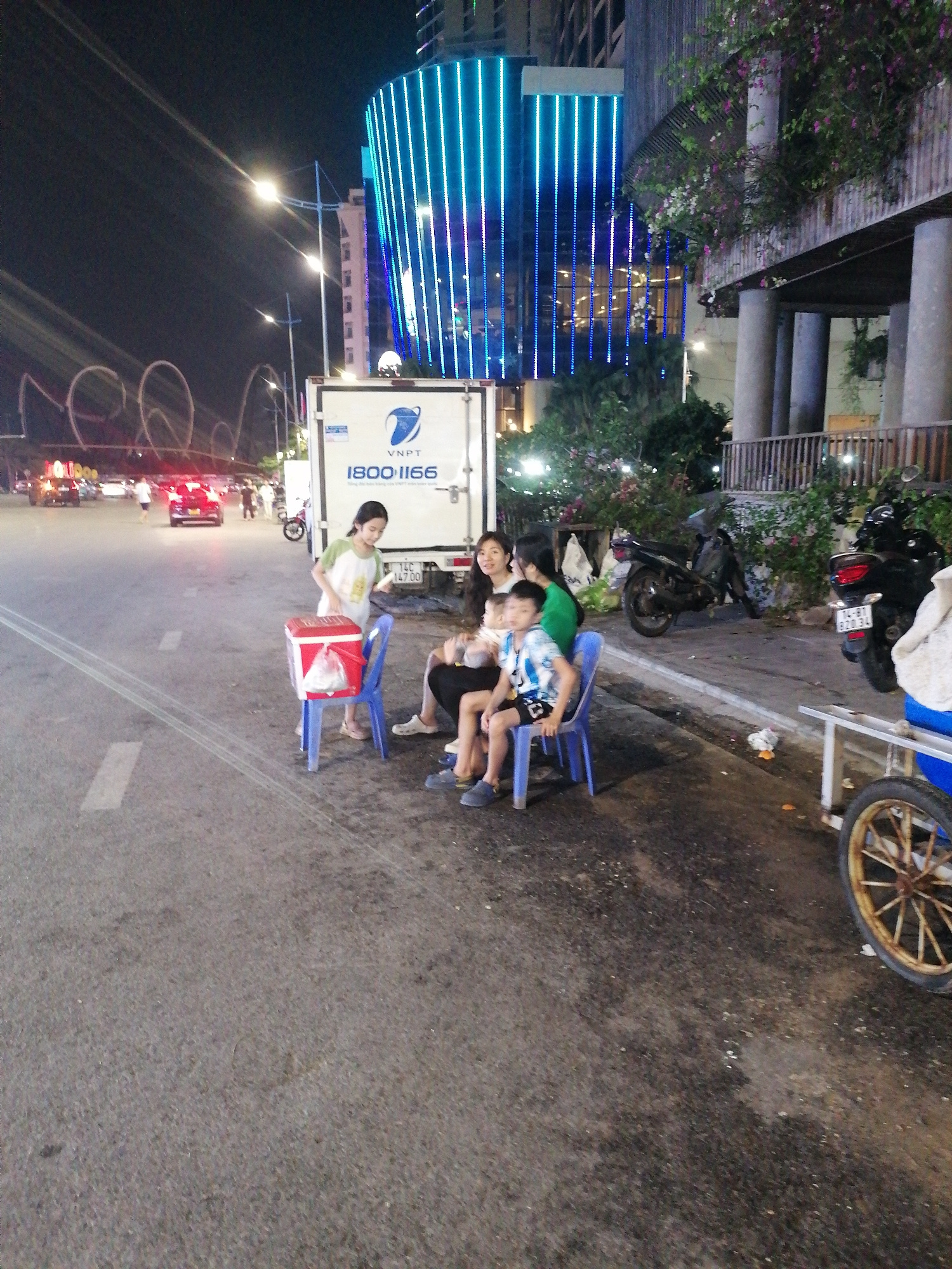In Bai Chay Ward, Vietnam, a family is sitting on blue plastic chairs next to a road at night. To the left, a red and white cooler sits atop another blue plastic chair. A girl stands nearby, possibly…read more