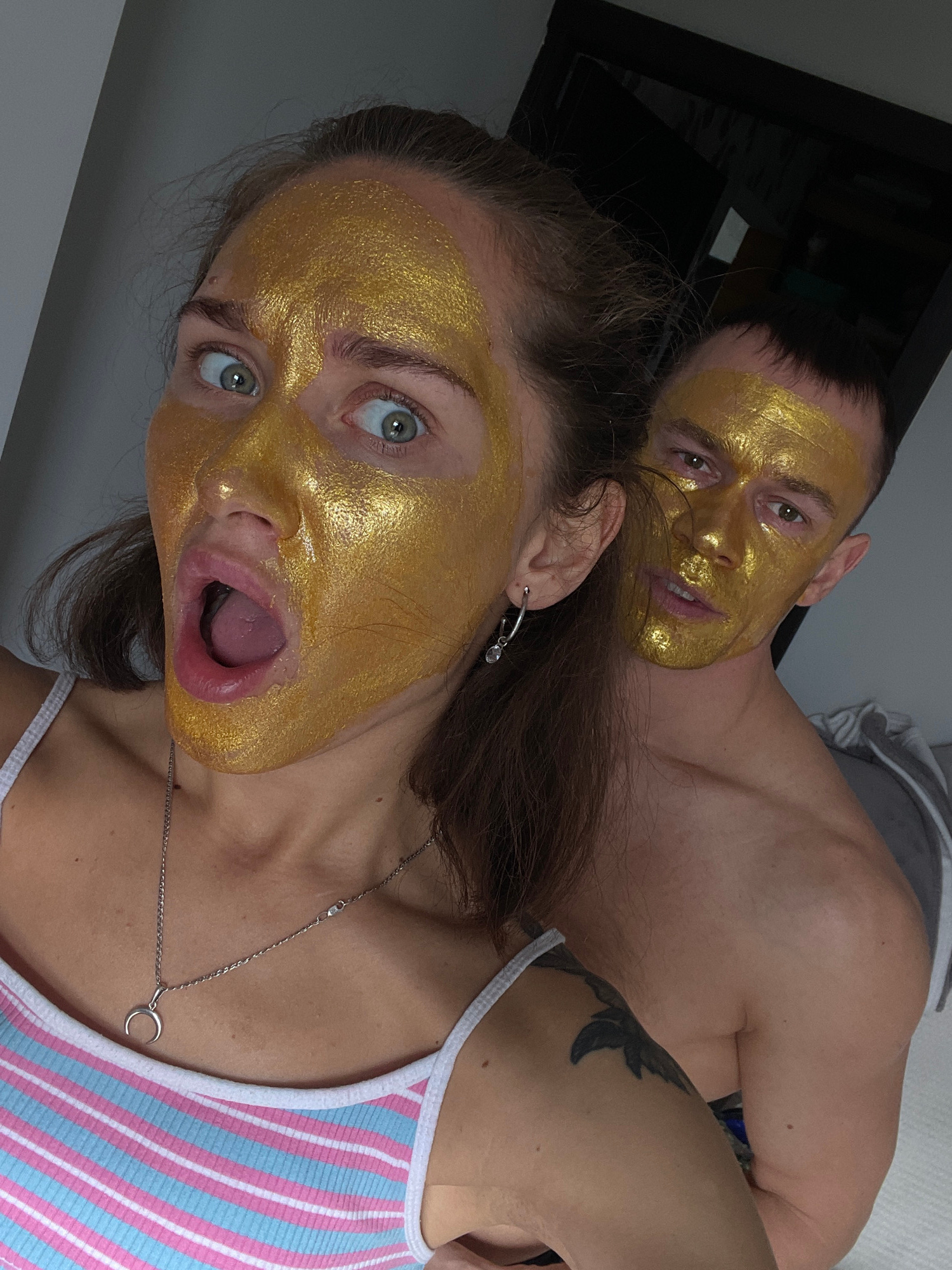 Two people, a man and a woman, are posing for a selfie with golden face masks on. The woman is in the foreground, wearing a striped pink and blue top and a silver necklace with a crescent moon pendant…read more