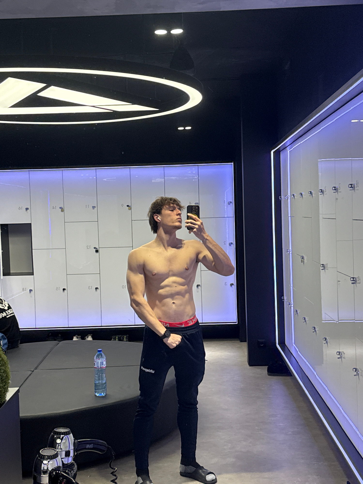 The image, rotated 90 degrees counter-clockwise, depicts a shirtless young man taking a mirror selfie in what appears to be a modern locker room or changing area, likely in a fitness center in Sofia,…read more