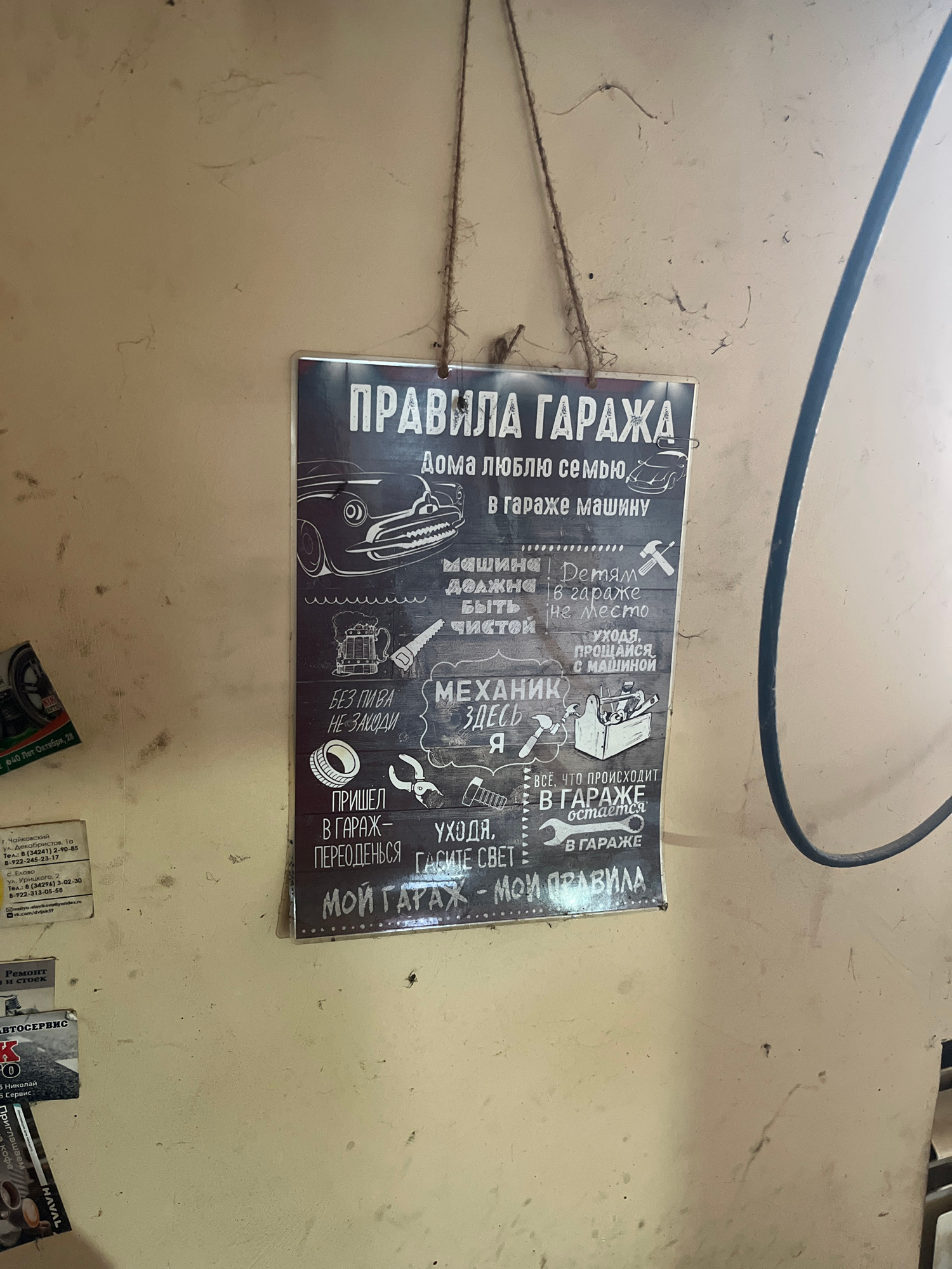 The image captures a dirty, light-colored wall, likely inside a garage or workshop. A dark cable or hose runs horizontally across the upper portion of the wall. The central subject is a dark-colored…read more