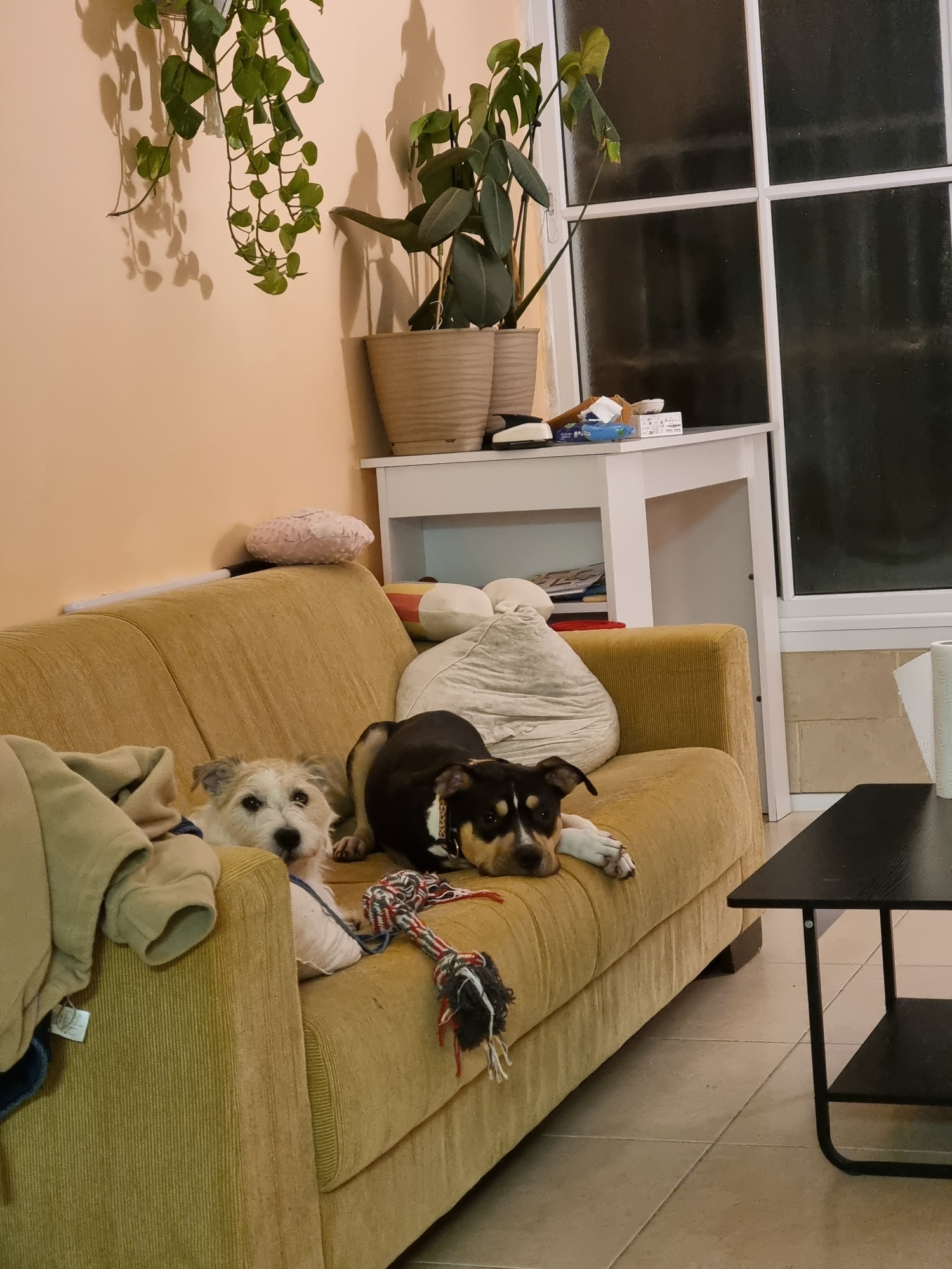 The scene depicts an indoor domestic environment, identified as a residence in Tel-Aviv, Israel. A mustard-yellow, ribbed fabric sofa occupies the central and left portions of the frame. Two canines a…read more