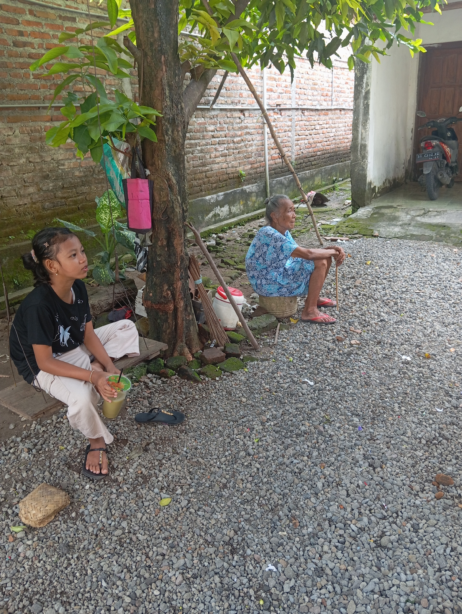 Two women are sitting outdoors on a gravel-covered ground in Baron, Indonesia. One older woman is seated on a low wooden stool, wearing a blue and white patterned dress and red sandals. She sits with…read more