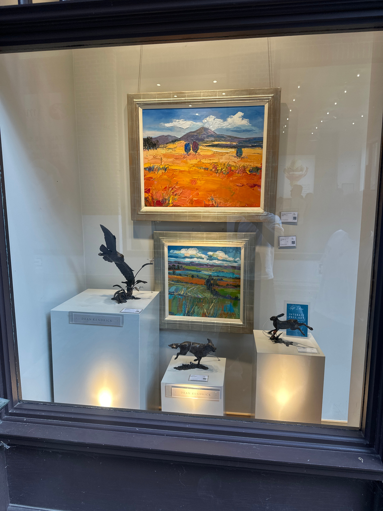 This media file captures a vibrant art gallery or shop window display, likely located in Canterbury, United Kingdom, during daytime. The scene is framed by a dark, ornate window casing, and the glass…read more