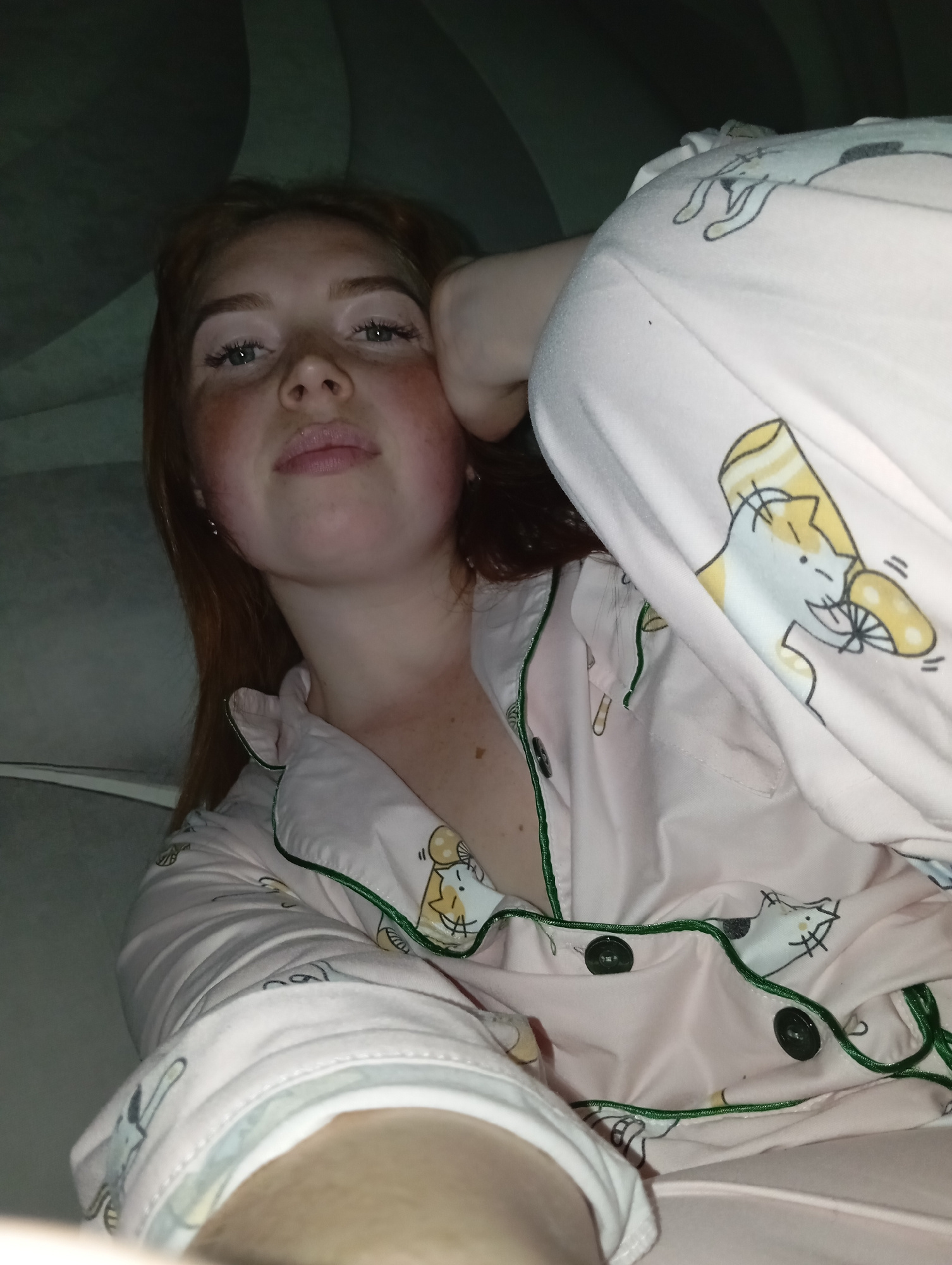 A red-haired woman wearing pink pajamas with a cartoon cat print lies on a gray sofa. The pajamas have green piping and dark buttons. The woman's face is visible, with gray eyes and fair skin, slightl…read more